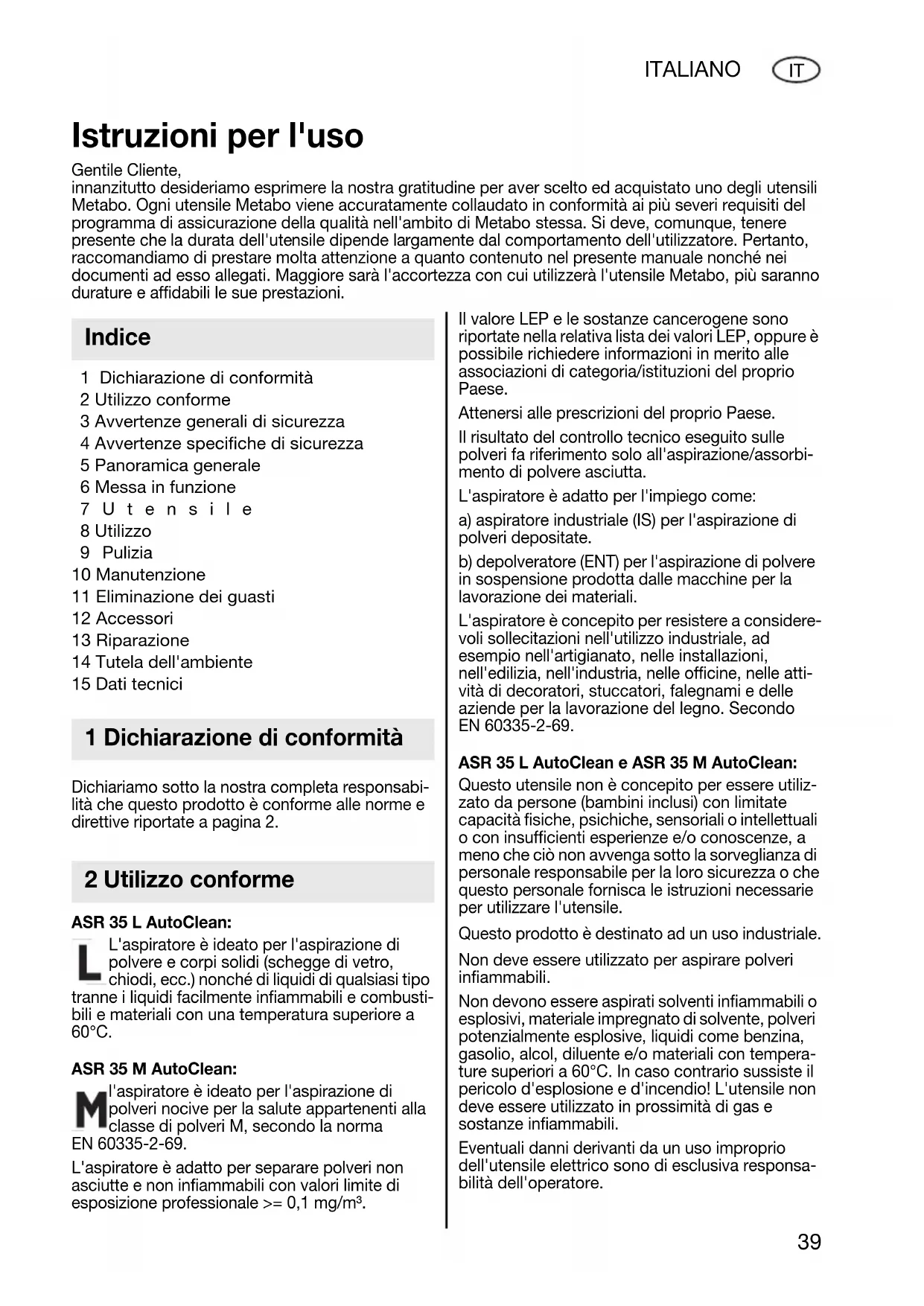 1 Dichiarazione di conformità 2 Utilizzo conforme 3 Avvertenze generali di sicurezza 4 Avvertenze specifiche di sicurezza 5 Panoramica generale 6 Messa in funzione 7Utensile 8 Utilizzo 9 Pulizia 10 Manutenzione 11 Eliminazione dei guasti 12 Accessori 13 Riparazione 14 Tutela dell'ambiente 15 Dati tecnici Dichiariamo sotto la nostra completa responsabi- lità che questo prodotto è conforme alle norme e direttive riportate a pagina 2. ASR 35 L AutoClean: L'aspiratore è ideato per l'aspirazione di polvere e corpi solidi (schegge di vetro, chiodi, ecc.) nonché di liquidi di qualsiasi tipo tranne i liquidi facilmente infiammabili e combusti- bili e materiali con una temperatura superiore a 60°C. ASR 35 M AutoClean: l'aspiratore è ideato per l'aspirazione di polveri nocive per la salute appartenenti alla classe di polveri M, secondo la norma EN 60335-2-69. L'aspiratore è adatto per separare polveri non asciutte e non infiammabili con valori limite di esposizione professionale >= 0,1 mg/m³. Il valore LEP e le sostanze cancerogene sono riportate nella relativa lista dei valori LEP, oppure è possibile richiedere informazioni in merito alle associazioni di categoria/istituzioni del proprio Paese. Attenersi alle prescrizioni del proprio Paese. Il risultato del controllo tecnico eseguito sulle polveri fa riferimento solo all'aspirazione/assorbi- mento di polvere asciutta. L'aspiratore è adatto per l'impiego come: a) aspiratore industriale (IS) per l'aspirazione di polveri depositate. b) depolveratore (ENT) per l'aspirazione di polvere in sospensione prodotta dalle macchine per la lavorazione dei materiali. L'aspiratore è concepito per resistere a considere- voli sollecitazioni nell'utilizzo industriale, ad esempio nell'artigianato, nelle installazioni, nell'edilizia, nell'industria, nelle officine, nelle atti- vità di decoratori, stuccatori, falegnami e delle aziende per la lavorazione del legno. Secondo EN 60335-2-69. ASR 35 L AutoClean e ASR 35 M AutoClean: Questo utensile non è concepito per essere utiliz- zato da persone (bambini inclusi) con limitate capacità fisiche, psichiche, sensoriali o intellettuali o con insufficienti esperienze e/o conoscenze, a meno che ciò non avvenga sotto la sorveglianza di personale responsabile per la loro sicurezza o che questo personale fornisca le istruzioni necessarie per utilizzare l'utensile. Questo prodotto è destinato ad un uso industriale. Non deve essere utilizzato per aspirare polveri infiammabili. Non devono essere aspirati solventi infiammabili o esplosivi, materiale impregnato di solvente, polveri potenzialmente esplosive, liquidi come benzina, gasolio, alcol, diluente e/o materiali con tempera- ture superiori a 60°C. In caso contrario sussiste il pericolo d'esplosione e d'incendio! L'utensile non deve essere utilizzato in prossimità di gas e sostanze infiammabili. Eventuali danni derivanti da un uso improprio dell'utensile elettrico sono di esclusiva responsa- bilità dell'operatore. Istruzioni per l'uso Gentile Cliente, innanzitutto desideriamo esprimere la nostra gratitudine per aver scelto ed acquistato uno degli utensili Metabo. Ogni utensile Metabo viene accuratamente collaudato in conformità ai più severi requisiti del programma di assicurazione della qualità nell'ambito di Metabo stessa. Si deve, comunque, tenere presente che la durata dell'utensile dipende largamente dal comportamento dell'utilizzatore. Pertanto, raccomandiamo di prestare molta attenzione a quanto contenuto nel presente manuale nonché nei documenti ad esso allegati. Maggiore sarà l'accortezza con cui utilizzerà l'utensile Metabo, più saranno durature e affidabili le sue prestazioni. Indice 1 Dichiarazione di conformità 2 Utilizzo conforme 17027067_0711 ASR 35 L_M AutoClean ENTWURF.book Seite 39 Montag, 25. Juli 2011 4:46 1640 ITALIANO