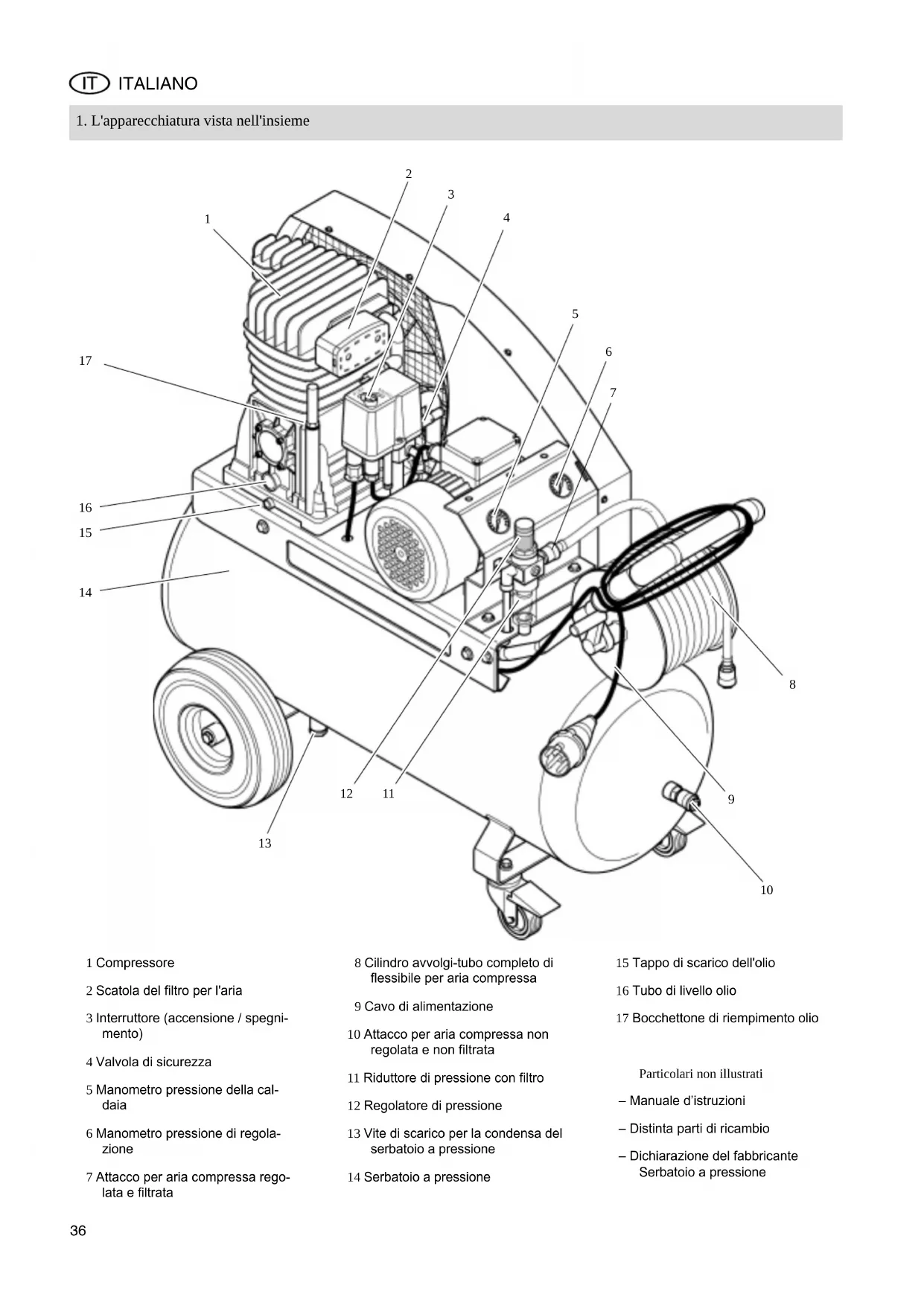 - Set accessory LPZ 6 (non illustrato) contente: pistola soffiatrice, apparecchio gonfia-pneumatici, niplo per gonfiaggio pneumatici, ago cavo per palloni, pistola per verniciatura a spruzzo, pistola spruzzatrice, tubo in tessuto di 5m . Cod. art. 090 104 4487