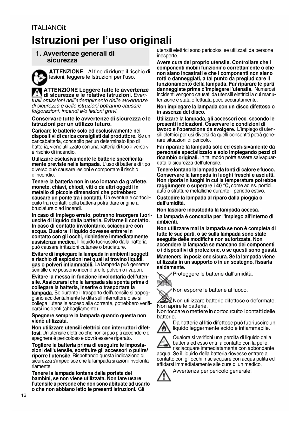 ATTENZIONE – Al fine di ridurre il rischio di lesioni, leggere le Istruzioni per l’uso. ATTENZIONE Leggere tutte le avvertenze di sicurezza e le relative istruzioni. Even- tuali omissioni nell’adempimento delle avvertenze di sicurezza e delle istruzioni potranno causare folgorazioni, incendi e/o lesioni gravi. Conservare tutte le avvertenze di sicurezza e le istruzioni per un utilizzo futuro. Caricare le batterie solo ed esclusivamente nei dispositivi di carica consigliati dal produttore. Se un caricabatteria, concepito per un determinato tipo di batteria, viene utilizzato con una batteria di tipo diverso vi è rischio di incendio. Utilizzare esclusivamente le batterie specificata- mente previste nella lampada. L’uso di batterie di tipo diverso può causare lesioni e comportare il rischio d’incendio. Tenere la batteria non in uso lontana da graffette, monete, chiavi, chiodi, viti o da altri oggetti in metallo di piccole dimensioni che potrebbero causare un ponte tra i contatti. Un eventuale cortocir- cuito tra i contatti della batteria potrà dare origine a bruciature o ad incendi. In caso di impiego errato, potranno insorgere fuori- uscite di liquido dalla batteria. Evitarne il contatto. In caso di contatto involontario, sciacquare con acqua. Qualora il liquido dovesse entrare in contatto con gli occhi, richiedere immediatamente assistenza medica. Il liquido fuoriuscito dalla batteria può causare irritazioni cutanee o bruciature. Evitare di impiegare la lampada in ambienti soggetti a rischio di esplosioni nei quali si trovino liquidi, gas o polveri infiammabili. La lampada può generare scintille che possono incendiare le polveri o i vapori. Evitare la messa in funzione involontaria dell’uten- sile. Assicurarsi che la lampada sia spenta prima di collegare la batteria, inserire o trasportare la lampada. Se durante il trasporto dell'utensile si appog- giano accidentalmente le dita sull'interruttore o se si collega l'utensile acceso alla corrente, potrebbero verifi- carsi incidenti (abbagliamento). Spegnere sempre la lampada quando questa non viene utilizzata. Non utilizzare utensili elettrici con interruttori difet- tosi. Un utensile elettrico che non si può più accendere o spegnere è pericoloso e dovrà essere riparato. Togliere la batteria prima di eseguire le imposta- zioni dell'utensile, sostituire gli accessori o pulire/ riporre l'utensile. Rispettando questa indicazione di sicurezza s'impedisce che la lampada si azioni involonta- riamente. Tenere la lampada lontana dalla portata dei bambini, se non viene utilizzata. Non fare usare l’utensile a persone che non sono abituate ad usarlo o che non abbiano letto le presenti istruzioni. Gli utensili elettrici sono pericolosi se utilizzati da persone inesperte. Avere cura del proprio utensile. Controllare che i componenti mobili funzionino correttamente o che non siano incastrati e che i componenti non siano rotti o danneggiati, a tal punto da pregiudicare il funzionamento della lampada. Far riparare le parti danneggiate prima d’impiegare l’utensile. Numerosi incidenti vengono causati da utensili elettrici la cui manu- tenzione è stata effettuata poco accuratamente. Non impiegare la lampada con un disco difettoso o in assenza del disco. Utilizzare la lampada, gli accessori ecc. secondo le presenti indicazioni. Osservare le condizioni di lavoro e l'operazione da svolgere. L’impiego di uten- sili elettrici per usi diversi da quelli consentiti potrà gene- rare situazioni di pericolo. Far riparare la lampada solo ed esclusivamente da personale specializzato e solo impiegando pezzi di ricambio originali. In tal modo potrà essere salvaguar- data la sicurezza dell’utensile. Tenere lontano la lampada da fonti di calore e fuoco. Conservare la lampada in luoghi freschi e asciutti. Non riporla in luoghi in cui la temperatura potrebbe raggiungere o superare i 40 °C, come ad es. portici, auto o strutture metalliche durante il periodo estivo. Custodire la lampada al riparo dalla pioggia o dall'umidità. Non lasciare incustodita la lampada accesa. La lampada è concepita per l'impiego all'interno di ambienti. Non utilizzare mai la lampada se non è completa di tutte le sue parti, o se sulla lampada sono state eseguite delle modifiche non autorizzate. Non accendere la lampada se mancano dei componenti o i dispositivi di protezione, o se questi sono guasti. Mantenersi in posizione sicura. Se la lampada viene utilizzata in un supporto o in un sostegno, fissarla saldamente. Proteggere le batterie dall'umidità. Non esporre le batterie al fuoco. Non utilizzare batterie difettose o deformate. Non aprire le batterie. Non toccare o mettere in cortocircuito i contatti delle batterie. Da batterie al litio difettose può fuoriuscire un liquido leggermente acido e infiammabile. Qualora si verifichi una perdita di liquido dalla batteria ed esso entri a contatto con la pelle, risciacquare immediatamente con abbondante acqua. Se il liquido della batteria dovesse entrare a contatto con gli occhi, risciacquare con acqua pulita ed affidarsi immediatamente alle cure di un medico. Avvertenza per pericolo generale! Istruzioni per l’uso originali