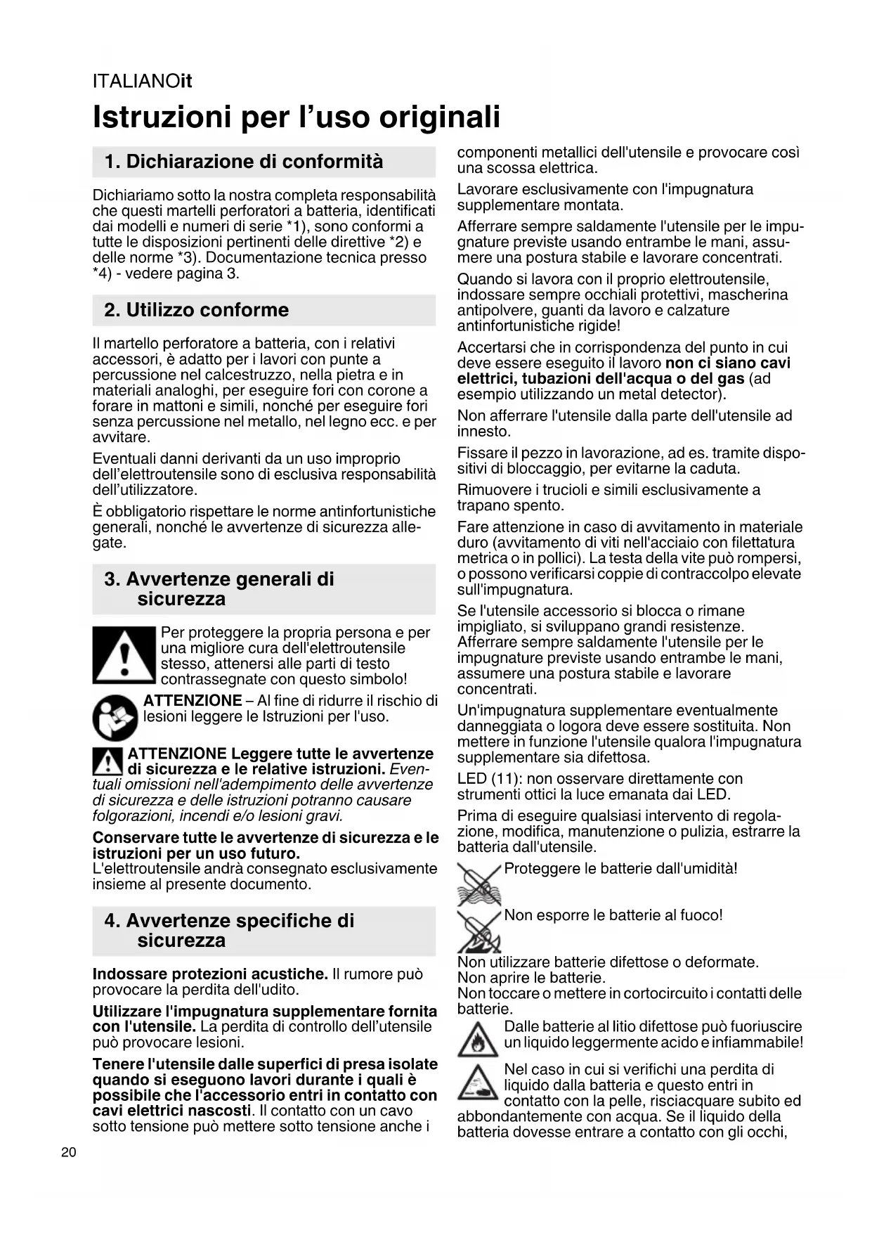 Dichiariamo sotto la nostra completa responsabilità che questi martelli perforatori a batteria, identificati dai modelli e numeri di serie *1), sono conformi a tutte le disposizioni pertinenti delle direttive *2) e delle norme *3). Documentazione tecnica presso *4) - vedere pagina 3. Il martello perforatore a batteria, con i relativi accessori, è adatto per i lavori con punte a percussione nel calcestruzzo, nella pietra e in materiali analoghi, per eseguire fori con corone a forare in mattoni e simili, nonché per eseguire fori senza percussione nel metallo, nel legno ecc. e per avvitare. Eventuali danni derivanti da un uso improprio dell’elettroutensile sono di esclusiva responsabilità dell’utilizzatore. È obbligatorio rispettare le norme antinfortunistiche generali, nonché le avvertenze di sicurezza alle- gate. Per proteggere la propria persona e per una migliore cura dell'elettroutensile stesso, attenersi alle parti di testo contrassegnate con questo simbolo! ATTENZIONE – Al fine di ridurre il rischio di lesioni leggere le Istruzioni per l'uso. ATTENZIONE Leggere tutte le avvertenze di sicurezza e le relative istruzioni. Even- tuali omissioni nell'adempimento delle avvertenze di sicurezza e delle istruzioni potranno causare folgorazioni, incendi e/o lesioni gravi. Conservare tutte le avvertenze di sicurezza e le istruzioni per un uso futuro. L'elettroutensile andrà consegnato esclusivamente insieme al presente documento. Indossare protezioni acustiche. Il rumore può provocare la perdita dell'udito. Utilizzare l'impugnatura supplementare fornita con l'utensile. La perdita di controllo dell’utensile può provocare lesioni. Tenere l'utensile dalle superfici di presa isolate quando si eseguono lavori durante i quali è possibile che l'accessorio entri in contatto con cavi elettrici nascosti. Il contatto con un cavo sotto tensione può mettere sotto tensione anche i componenti metallici dell'utensile e provocare così una scossa elettrica. Lavorare esclusivamente con l'impugnatura supplementare montata. Afferrare sempre saldamente l'utensile per le impu- gnature previste usando entrambe le mani, assu- mere una postura stabile e lavorare concentrati. Quando si lavora con il proprio elettroutensile, indossare sempre occhiali protettivi, mascherina antipolvere, guanti da lavoro e calzature antinfortunistiche rigide! Accertarsi che in corrispondenza del punto in cui deve essere eseguito il lavoro non ci siano cavi elettrici, tubazioni dell'acqua o del gas (ad esempio utilizzando un metal detector). Non afferrare l'utensile dalla parte dell'utensile ad innesto. Fissare il pezzo in lavorazione, ad es. tramite dispo- sitivi di bloccaggio, per evitarne la caduta. Rimuovere i trucioli e simili esclusivamente a trapano spento. Fare attenzione in caso di avvitamento in materiale duro (avvitamento di viti nell'acciaio con filettatura metrica o in pollici). La testa della vite può rompersi, o possono verificarsi coppie di contraccolpo elevate sull'impugnatura. Se l'utensile accessorio si blocca o rimane impigliato, si sviluppano grandi resistenze. Afferrare sempre saldamente l'utensile per le impugnature previste usando entrambe le mani, assumere una postura stabile e lavorare concentrati. Un'impugnatura supplementare eventualmente danneggiata o logora deve essere sostituita. Non mettere in funzione l'utensile qualora l'impugnatura supplementare sia difettosa. LED (11): non osservare direttamente con strumenti ottici la luce emanata dai LED. Prima di eseguire qualsiasi intervento di regola- zione, modifica, manutenzione o pulizia, estrarre la batteria dall'utensile. Proteggere le batterie dall'umidità! Non esporre le batterie al fuoco! Non utilizzare batterie difettose o deformate. Non aprire le batterie. Non toccare o mettere in cortocircuito i contatti delle batterie. Dalle batterie al litio difettose può fuoriuscire un liquido leggermente acido e infiammabile! Nel caso in cui si verifichi una perdita di liquido dalla batteria e questo entri in contatto con la pelle, risciacquare subito ed abbondantemente con acqua. Se il liquido della batteria dovesse entrare a contatto con gli occhi, Istruzioni per l’uso originali