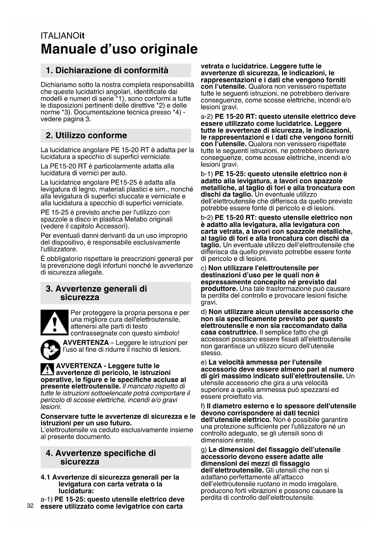 Manuale d’uso originale Dichiariamo sotto la nostra completa responsabilità che queste lucidatrici angolari, identificate dai modelli e numeri di serie *1), sono conformi a tutte le disposizioni pertinenti delle direttive *2) e delle norme *3). Documentazione tecnica presso *4) - vedere pagina 3. La lucidatrice angolare PE 15-20 RT è adatta per la lucidatura a specchio di superfici verniciate. La PE15-20 RT è particolarmente adatta alla lucidatura di vernici per auto. La lucidatrice angolare PE15-25 è adatta alla levigatura di legno, materiali plastici e sim., nonché alla levigatura di superfici stuccate e verniciate e alla lucidatura a specchio di superfici verniciate. PE 15-25 è previsto anche per l'utilizzo con spazzole a disco in plastica Metabo originali (vedere il capitolo Accessori). Per eventuali danni derivanti da un uso improprio del dispositivo, è responsabile esclusivamente l'utilizzatore. È obbligatorio rispettare le prescrizioni generali per la prevenzione degli infortuni nonché le avvertenze di sicurezza allegate. Per proteggere la propria persona e per una migliore cura dell'elettroutensile, attenersi alle parti di testo contrassegnate con questo simbolo! AVVERTENZA – Leggere le istruzioni per l’uso al fine di ridurre il rischio di lesioni. AVVERTENZA - Leggere tutte le avvertenze di pericolo, le istruzioni operative, le figure e le specifiche accluse al presente elettroutensile. Il mancato rispetto di tutte le istruzioni sottoelencate potrà comportare il pericolo di scosse elettriche, incendi e/o gravi lesioni. Conservare tutte le avvertenze di sicurezza e le istruzioni per un uso futuro. L'elettroutensile va ceduto esclusivamente insieme al presente documento.