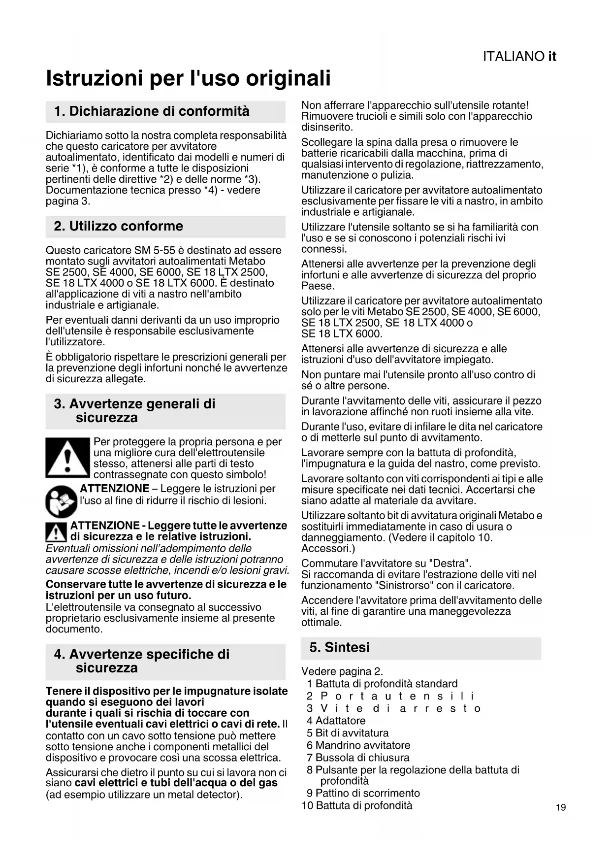 Istruzioni per l'uso originali Dichiariamo sotto la nostra completa responsabilità che questo caricatore per avvitatore autoalimentato, identificato dai modelli e numeri di serie *1), è conforme a tutte le disposizioni pertinenti delle direttive *2) e delle norme *3). Documentazione tecnica presso *4) - vedere pagina 3. Questo caricatore SM 5-55 è destinato ad essere montato sugli avvitatori autoalimentati Metabo SE 2500, SE 4000, SE 6000, SE 18 LTX 2500, SE 18 LTX 4000 o SE 18 LTX 6000. È destinato all'applicazione di viti a nastro nell'ambito industriale e artigianale. Per eventuali danni derivanti da un uso improprio dell'utensile è responsabile esclusivamente l'utilizzatore. È obbligatorio rispettare le prescrizioni generali per la prevenzione degli infortuni nonché le avvertenze di sicurezza allegate. Per proteggere la propria persona e per una migliore cura dell'elettroutensile stesso, attenersi alle parti di testo contrassegnate con questo simbolo! ATTENZIONE – Leggere le istruzioni per l'uso al fine di ridurre il rischio di lesioni. ATTENZIONE - Leggere tutte le avvertenze di sicurezza e le relative istruzioni. Eventuali omissioni nell’adempimento delle avvertenze di sicurezza e delle istruzioni potranno causare scosse elettriche, incendi e/o lesioni gravi. Conservare tutte le avvertenze di sicurezza e le istruzioni per un uso futuro. L'elettroutensile va consegnato al successivo proprietario esclusivamente insieme al presente documento. Tenere il dispositivo per le impugnature isolate quando si eseguono dei lavori durante i quali si rischia di toccare con l'utensile eventuali cavi elettrici o cavi di rete. Il contatto con un cavo sotto tensione può mettere sotto tensione anche i componenti metallici del dispositivo e provocare così una scossa elettrica. Assicurarsi che dietro il punto su cui si lavora non ci siano cavi elettrici e tubi dell'acqua o del gas (ad esempio utilizzare un metal detector). Non afferrare l'apparecchio sull'utensile rotante! Rimuovere trucioli e simili solo con l'apparecchio disinserito. Scollegare la spina dalla presa o rimuovere le batterie ricaricabili dalla macchina, prima di qualsiasi intervento di regolazione, riattrezzamento, manutenzione o pulizia. Utilizzare il caricatore per avvitatore autoalimentato esclusivamente per fissare le viti a nastro, in ambito industriale e artigianale. Utilizzare l'utensile soltanto se si ha familiarità con l'uso e se si conoscono i potenziali rischi ivi connessi. Attenersi alle avvertenze per la prevenzione degli infortuni e alle avvertenze di sicurezza del proprio Paese. Utilizzare il caricatore per avvitatore autoalimentato solo per le viti Metabo SE 2500, SE 4000, SE 6000, SE 18 LTX 2500, SE 18 LTX 4000 o SE 18 LTX 6000. Attenersi alle avvertenze di sicurezza e alle istruzioni d'uso dell'avvitatore impiegato. Non puntare mai l'utensile pronto all'uso contro di sé o altre persone. Durante l'avvitamento delle viti, assicurare il pezzo in lavorazione affinché non ruoti insieme alla vite. Durante l'uso, evitare di infilare le dita nel caricatore o di metterle sul punto di avvitamento. Lavorare sempre con la battuta di profondità, l'impugnatura e la guida del nastro, come previsto. Lavorare soltanto con viti corrispondenti ai tipi e alle misure specificate nei dati tecnici. Accertarsi che siano adatte al materiale da avvitare. Utilizzare soltanto bit di avvitatura originali Metabo e sostituirli immediatamente in caso di usura o danneggiamento. (Vedere il capitolo 10. Accessori.) Commutare l'avvitatore su "Destra". Si raccomanda di evitare l'estrazione delle viti nel funzionamento "Sinistrorso" con il caricatore. Accendere l'avvitatore prima dell'avvitamento delle viti, al fine di garantire una maneggevolezza ottimale. Vedere pagina 2. 1 Battuta di profondità standard 2Portautensili 3Vite di arresto 4 Adattatore 5 Bit di avvitatura 6 Mandrino avvitatore 7 Bussola di chiusura 8 Pulsante per la regolazione della battuta di profondità 9 Pattino di scorrimento 10 Battuta di profondità
