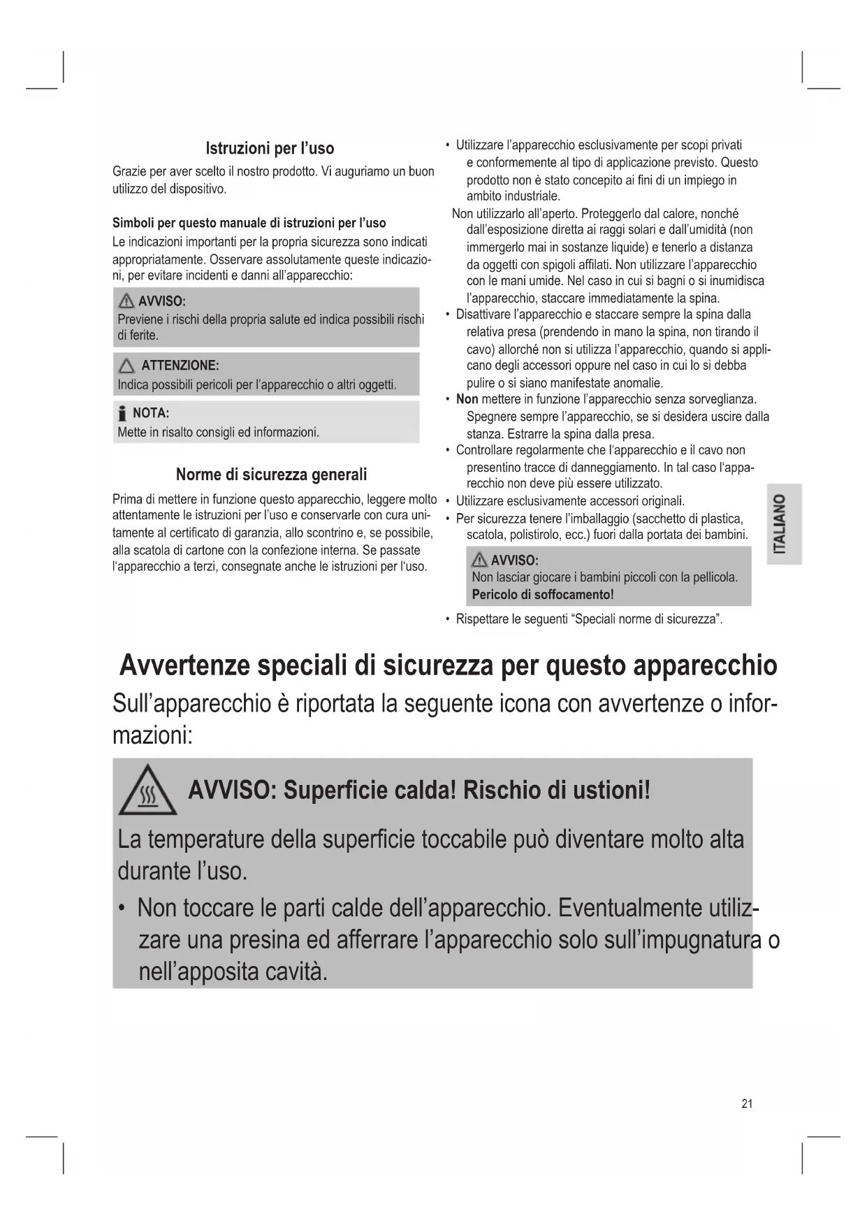 - Non toccare le parti calde dell’apparecchio. Eventualmente utiliz- zare una presina ed afferrare l’apparecchio solo sull’impugnatura o nell’apposita cavità.22 AVVISO: