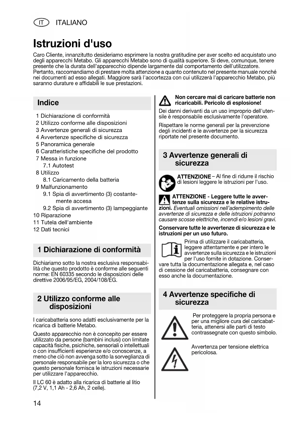 10 Riparazione 11 Tutela dell'ambiente 12 Dati tecnici Dichiariamo sotto la nostra esclusiva responsabi- lità che questo prodotto è conforme alle seguenti norme: EN 60335 secondo le disposizioni delle direttive 2006/95/EG, 2004/108/EG. I caricabatteria sono adatti esclusivamente per la ricarica di batterie Metabo. Questo apparecchio non è concepito per essere utilizzato da persone (bambini inclusi) con limitate capacità fisiche, psichiche, sensoriali o intellettuali o con insufficienti esperienze e/o conoscenze, a meno che ciò non avvenga sotto la sorveglianza di personale responsabile per la loro sicurezza o che questo personale fornisca le istruzioni necessarie per utilizzare l'apparecchio. Il LC 60 è adatto alla ricarica di batterie al litio (7,2 V, 1,1 Ah - 2,6 Ah, 2 celle). Non cercare mai di caricare batterie non ricaricabili. Pericolo di esplosione! Dei danni derivanti da un uso improprio dell'uten- sile è responsabile esclusivamente l'operatore. Rispettare le norme generali per la prevenzione degli incidenti e le avvertenze per la sicurezza riportate nel presente documento. ATTENZIONE – Al fine di ridurre il rischio di lesioni leggere le istruzioni per l'uso. ATTENZIONE - Leggere tutte le avver- tenze sulla sicurezza e le relative istru- zioni. Eventuali omissioni nell’adempimento delle avvertenze di sicurezza e delle istruzioni potranno causare scosse elettriche, incendi e/o lesioni gravi. Conservare tutte le avvertenze di sicurezza e le istruzioni per un uso futuro. Prima di utilizzare il caricabatteria, leggere attentamente e per intero le avvertenze sulla sicurezza e le istruzioni per l'uso fornite in dotazione. Conser- vare tutta la documentazione allegata e, nel caso di cessione del caricabatteria, consegnare con esso anche la documentazione. Per proteggere la propria persona e per una migliore cura del caricabat- teria, attenersi alle parti di testo contrassegnate con questo simbolo. Avvertenza per tensione elettrica pericolosa. Istruzioni d'uso Caro Cliente, innanzitutto desideriamo esprimere la nostra gratitudine per aver scelto ed acquistato uno degli apparecchi Metabo. Gli apparecchi Metabo sono di qualità superiore. Si deve, comunque, tenere presente che la durata dell'apparecchio dipende largamente dal comportamento dell'utilizzatore. Pertanto, raccomandiamo di prestare molta attenzione a quanto contenuto nel presente manuale nonché nei documenti ad esso allegati. Maggiore sarà l'accortezza con cui utilizzerà l'apparecchio Metabo, più saranno durature e affidabili le sue prestazioni. Indice 1 Dichiarazione di conformità 2 Utilizzo conforme alle disposizioni 3 Avvertenze generali di sicurezza 4 Avvertenze specifiche di sicurezzaITALIANO