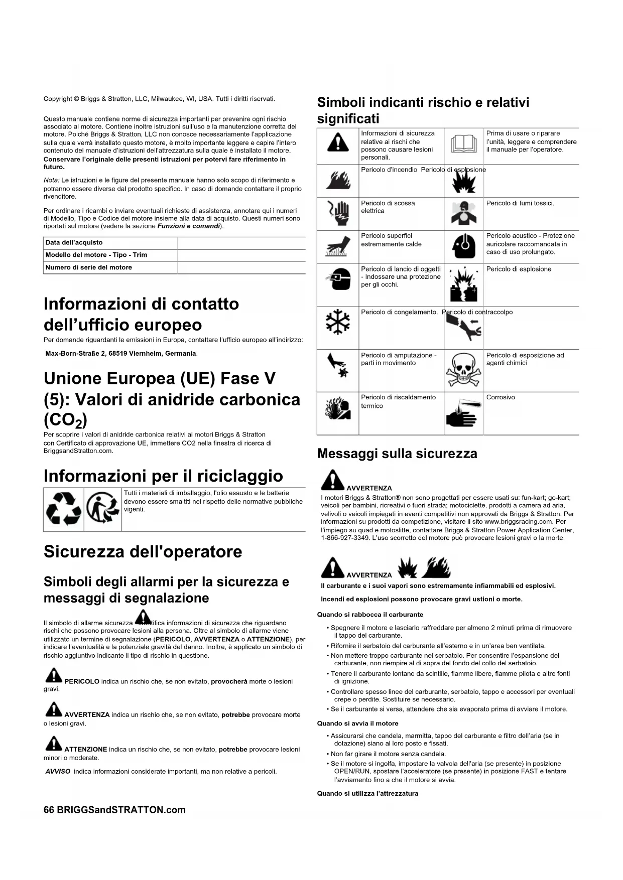 käsittely tai varastointi tai moottorin väärä asennus. Takuuhuoltoa on saatavilla ainoastaan valtuutetuista Briggs & Stratton - huoltopisteistä. Lähimmän valtuutetun huoltoliikkeen löydät jälleenmyyjäkartalta verkkosivulla BRIGGSandSTRATTON.COM tai soittamalla numeroon 1-800-233-3723 (Yhdysvallat). 80004537 (versio F)66 BRIGGSandSTRATTON.com Copyright © Briggs & Stratton, LLC, Milwaukee, WI, USA. Tutti i diritti riservati. Questo manuale contiene norme di sicurezza importanti per prevenire ogni rischio associato al motore. Contiene inoltre istruzioni sull’uso e la manutenzione corretta del motore. Poiché Briggs & Stratton, LLC non conosce necessariamente l’applicazione sulla quale verrà installato questo motore, è molto importante leggere e capire l’intero contenuto del manuale d’istruzioni dell’attrezzatura sulla quale è installato il motore. Conservare l’originale delle presenti istruzioni per potervi fare riferimento in futuro. Nota:Le istruzioni e le figure del presente manuale hanno solo scopo di riferimento e potranno essere diverse dal prodotto specifico. In caso di domande contattare il proprio rivenditore. Per ordinare i ricambi o inviare eventuali richieste di assistenza, annotare qui i numeri di Modello, Tipo e Codice del motore insieme alla data di acquisto. Questi numeri sono riportati sul motore (vedere la sezioneFunzioni e comandi). Data dell’acquisto Modello del motore - Tipo - Trim Numero di serie del motore Informazioni di contatto dell’ufficio europeo Per domande riguardanti le emissioni in Europa, contattare l’ufficio europeo all’indirizzo: Max-Born-Straße 2, 68519 Viernheim, Germania. Unione Europea (UE) Fase V (5): Valori di anidride carbonica (CO