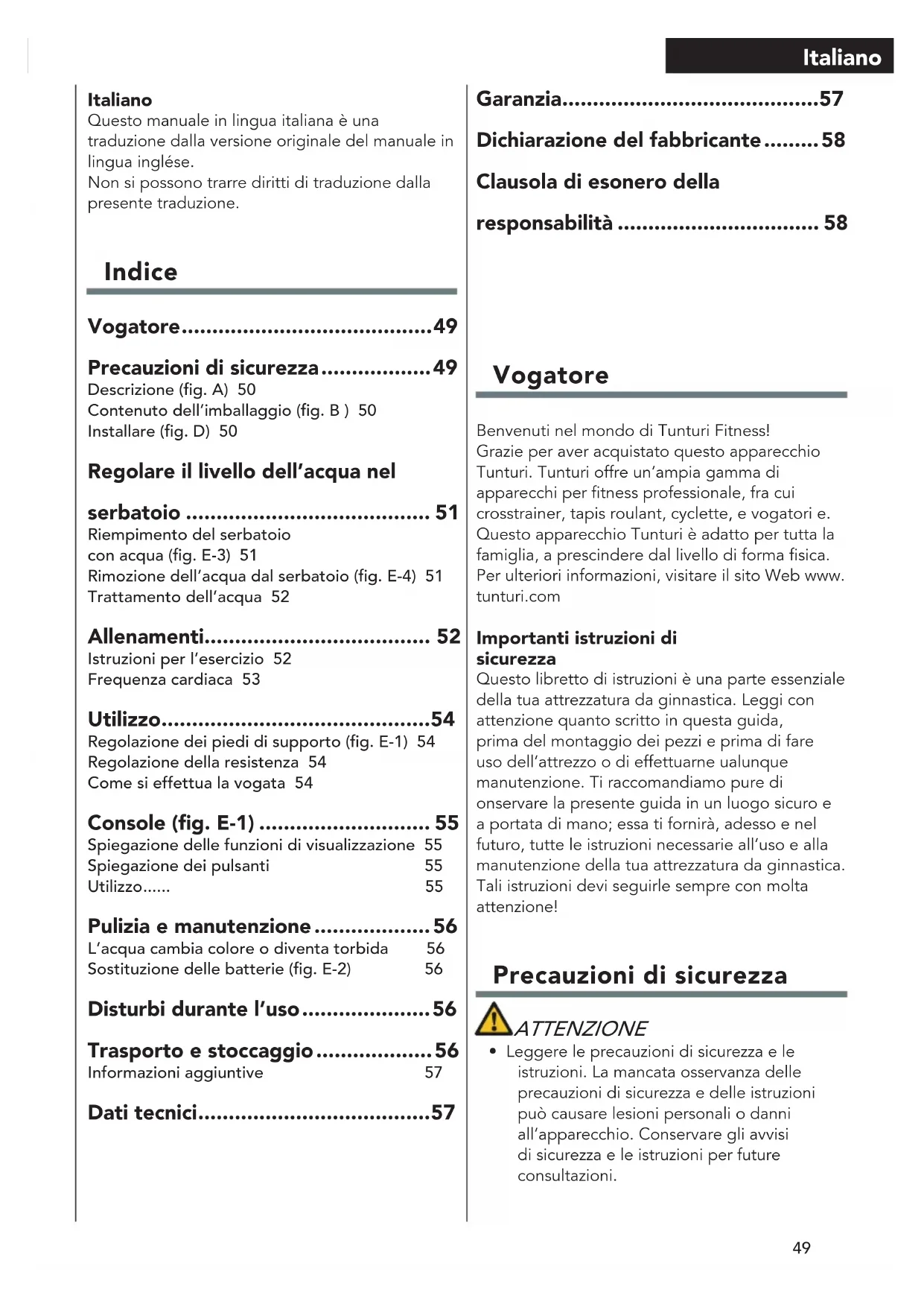 - Leggere le precauzioni di sicurezza e le istruzioni. La mancata osservanza delle precauzioni di sicurezza e delle istruzioni può causare lesioni personali o danni all’apparecchio. Conservare gli avvisi di sicurezza e le istruzioni per future consultazioni. Italiano Questo manuale in lingua italiana è una traduzione dalla versione originale del manuale in lingua inglése. Non si possono trarre diritti di traduzione dalla presente traduzione. Indice Vogatore ......................................... 49 Precauzioni di sicurezza .................. 49 Descrizione (g. A) 50Contenuto dell’imballaggio (g. B ) 50Installare (g. D) 50 Regolare il livello dell’acqua nel serbatoio ........................................ 51 Riempimento del serbatoio con acqua (g. E-3) 51Rimozione dell’acqua dal serbatoio (g. E-4) 51Trattamento dell’acqua 52 Allenamenti..................................... 52 Istruzioni per l’esercizio 52Frequenza cardiaca 53 Utilizzo ............................................ 54 Regolazione dei piedi di supporto (g. E-1) 54Regolazione della resistenza 54Come si effettua la vogata 54 Console (g. E-1) ............................ 55 Spiegazione delle funzioni di visualizzazione 55Spiegazione dei pulsanti 55Utilizzo ...... 55 Pulizia e manutenzione ................... 56 L’acqua cambia colore o diventa torbida 56Sostituzione delle batterie (g. E-2) 56 Disturbi durante l’uso ..................... 56 Trasporto e stoccaggio ................... 56 Informazioni aggiuntive 57 Dati tecnici ...................................... 57 Garanzia .......................................... 57 Dichiarazione del fabbricante ......... 58 Clausola di esonero della responsabilità ................................. 5850 Italiano ATTENZIONE