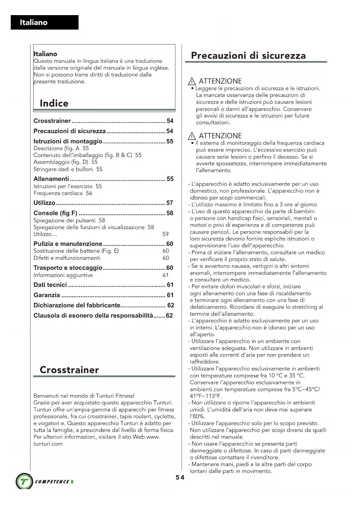 Batterijen maat 2x2x AA Garantie Garantie voor eigenaars van Tunturi trainingsapparatuur Garantievoorwaarden De consument ontleent wettelijke rechten aan de van toepassing zijnde nationale wetgeving aangaande de handel in consumentengoederen en de garantie zal deze rechten niet beperken. De “Garantie voor de Eigenaar” geldt alleen dan wanneer het toestel wordt gebruikt in de door Tunturi New Fitness BV voor dat toestel toegestane gebruiksomgeving. Voor elk toestel wordt de toegestane gebruiksomgeving beschreven in de gebruiksaanwijzing van het toestel. Garantievoorwaarden De garantievoorwaarden gaan in vanaf de datum van aankoop. Deze kunnen per land verschillen. Vraag in de winkel bij u in de buurt naar de garantievoorwaarden. Garantiedekking In geen enkele omstandigheid zal Tunturi New Fitness BV of een wederverkoper van Tunturi aansprakelijk zijn voor eventuele indirecte schade geleden door de koper, zoals verlies van gebruiksnut of inkomstenderving of andere indirecte economische gevolgen. Garantiebeperkingen De garantie dekt defecten van het toestel die het gevolg zijn van materiaalfouten of onjuist uitgevoerd werk, mits het toestel zijn originele samenstelling heeft. De garantie betreft alleen defecten die blijken tijdens normaal gebruik overeenkomstig de meegeleverde gebruiksaanwijzing, mits de montage-, onderhouds- en gebruiksaanwijzingen van Tunturi zijn opgevolgd. Tunturi New Fitness BV en zijn wederverkopers zijn niet aansprakelijk voor defecten tengevolge van factoren waarop zij geen invloed kunnen uitoefenen. De garantie betreft alleen de eerste eigenaar van het toestel en is alleen geldig in landen waar een geautoriseerde importeur van Tunturi New Fitness BV is gevestigd. De garantie betreft geen trainingstoestellen of onderdelen die zijn gewijzigd zonder toestemming van Tunturi New Fitness BV. De garantie dekt geen defecten tengevolge van normale slijtage, onjuist gebruik, gebruik in omstandigheden waarvoor het toestel niet is bedoeld, corrosie of schade ontstaan tijdens laden of transport. De garantie geldt niet voor geluiden die ontstaan door het gebruik, als ze het gebruik van het apparaat niet wezenlijk belemmeren en niet veroorzaakt zijn door een defect aan het apparaat. De garantie omvat ook geen onderhouds- maatregelen, zoals reiniging, smering of normale inspectie van onderdelen, noch dergelijke montagewerkzaamheden die de klant zelf kan uitvoeren en die geen speciale demontage en montage van het toestel vereisen. Dit soort maatregelen zijn bijv. vervanging van monitoren, pedalen of andere vergelijkbare eenvoudige onderdelen. Garantieherstel dat is uitgevoerd door een ander dan de geautoriseerde Tunturi-vertegenwoordiger wordt niet vergoed. De garantie geldt alleen voor normaal, voorgeschreven gebruik van het product zoals beschreven in de handleiding. Verklaring van de fabrikant Tunturi New Fitness BV verklaart dat het product voldoet aan de volgende normen en richtlijnen: EN 957 (HB), 89/336/EEG. Het product is derhalve voorzien van het CE-label. 01-2017 Tunturi New Fitness BV Purmerweg 1 1311 XE Almere The Netherlands Disclaimer © 2017 Tunturi New Fitness BV Alle rechten voorbehouden. Het product en de handleiding zijn aan veranderingen onderhevig. Specificaties kunnen zonder verdere kennisgeving worden veranderd.54 Italiano Crosstrainer Benvenuti nel mondo di Tunturi Fitness!Grazie per aver acquistato questo apparecchio Tunturi. Tunturi offre un‘ampia gamma di apparecchi per fitness professionale, fra cui crosstrainer, tapis roulant, cyclette, e vogatori e. Questo apparecchio Tunturi è adatto per tutta la famiglia, a prescindere dal livello di forma fisica. Per ulteriori informazioni, visitare il sito Web www.tunturi.com Precauzioni di sicurezza ⚠ ATTENZIONE
