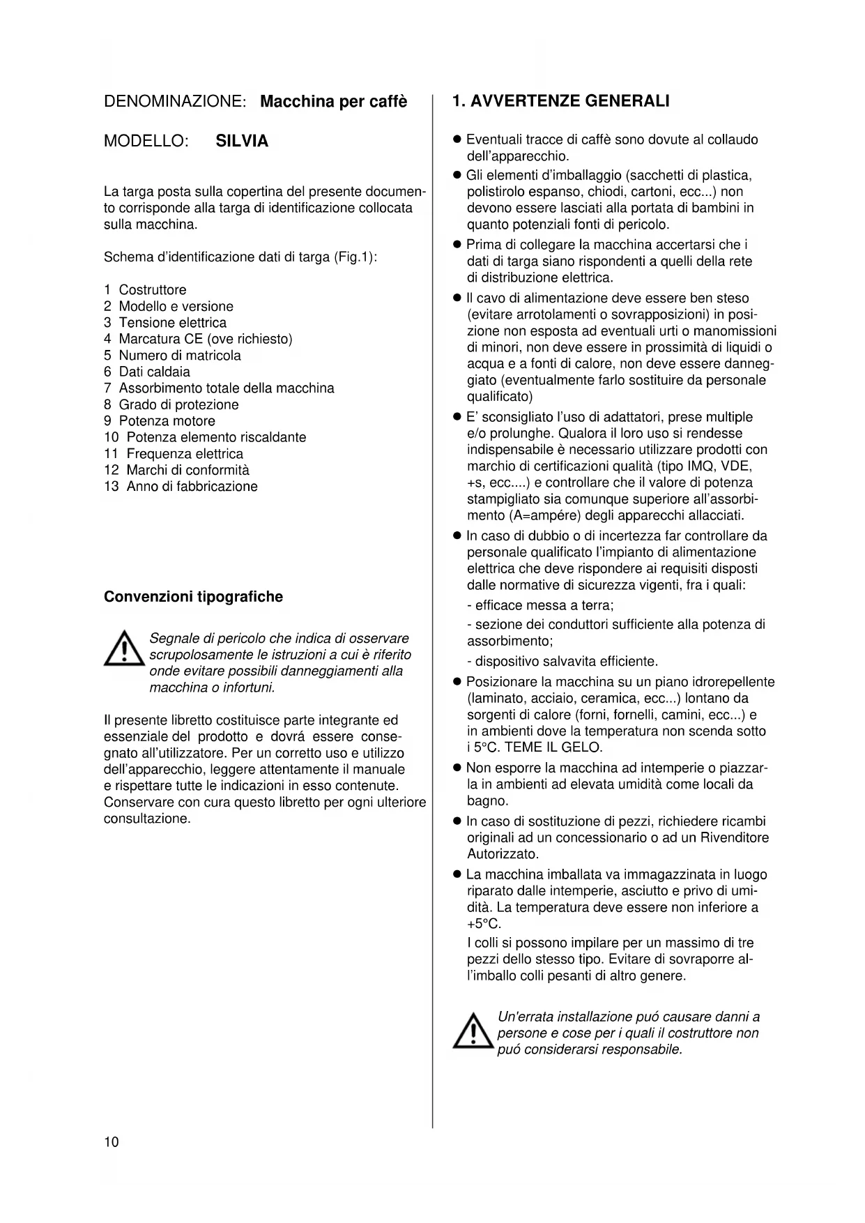 Eventuali tracce di caffè sono dovute al collaudo dell’apparecchio. Gli elementi d’imballaggio (sacchetti di plastica, polistirolo espanso, chiodi, cartoni, ecc...) non devono essere lasciati alla portata di bambini in quanto potenziali fonti di pericolo. Prima di collegare la macchina accertarsi che i dati di targa siano rispondenti a quelli della rete di distribuzione elettrica. Il cavo di alimentazione deve essere ben steso (evitare arrotolamenti o sovrapposizioni) in posi- zione non esposta ad eventuali urti o manomissioni di minori, non deve essere in prossimità di liquidi o acqua e a fonti di calore, non deve essere danneg- giato (eventualmente farlo sostituire da personale qualificato) E’ sconsigliato l’uso di adattatori, prese multiple e/o prolunghe. Qualora il loro uso si rendesse indispensabile è necessario utilizzare prodotti con marchio di certificazioni qualità (tipo IMQ, VDE, +s, ecc....) e controllare che il valore di potenza stampigliato sia comunque superiore all’assorbi- mento (A=ampére) degli apparecchi allacciati. In caso di dubbio o di incertezza far controllare da personale qualificato l’impianto di alimentazione elettrica che deve rispondere ai requisiti disposti dalle normative di sicurezza vigenti, fra i quali: - efficace messa a terra; - sezione dei conduttori sufficiente alla potenza di assorbimento; - dispositivo salvavita efficiente. Posizionare la macchina su un piano idrorepellente (laminato, acciaio, ceramica, ecc...) lontano da sorgenti di calore (forni, fornelli, camini, ecc...) e in ambienti dove la temperatura non scenda sotto i 5°C. TEME IL GELO. Non esporre la macchina ad intemperie o piazzar- la in ambienti ad elevata umidità come locali da bagno. In caso di sostituzione di pezzi, richiedere ricambi originali ad un concessionario o ad un Rivenditore Autorizzato. La macchina imballata va immagazzinata in luogo riparato dalle intemperie, asciutto e privo di umi- dità. La temperatura deve essere non inferiore a +5°C. I colli si possono impilare per un massimo di tre pezzi dello stesso tipo. Evitare di sovraporre al- l’imballo colli pesanti di altro genere. Un'errata installazione puó causare danni a persone e cose per i quali il costruttore non puó considerarsi responsabile. DENOMINAZIONE: Macchina per caffè MODELLO: SILVIA La targa posta sulla copertina del presente documen- to corrisponde alla targa di identificazione collocata sulla macchina. Schema d’identificazione dati di targa (Fig.1): 1 Costruttore 2 Modello e versione 3 Tensione elettrica 4 Marcatura CE (ove richiesto) 5 Numero di matricola 6 Dati caldaia 7 Assorbimento totale della macchina 8 Grado di protezione 9 Potenza motore 10 Potenza elemento riscaldante 11 Frequenza elettrica 12 Marchi di conformità 13 Anno di fabbricazione Convenzioni tipografiche Segnale di pericolo che indica di osservare scrupolosamente le istruzioni a cui è riferito onde evitare possibili danneggiamenti alla macchina o infortuni. Il presente libretto costituisce parte integrante ed essenziale del prodotto e dovrá essere conse- gnato all’utilizzatore. Per un corretto uso e utilizzo dell’apparecchio, leggere attentamente il manuale e rispettare tutte le indicazioni in esso contenute. Conservare con cura questo libretto per ogni ulteriore consultazione.11