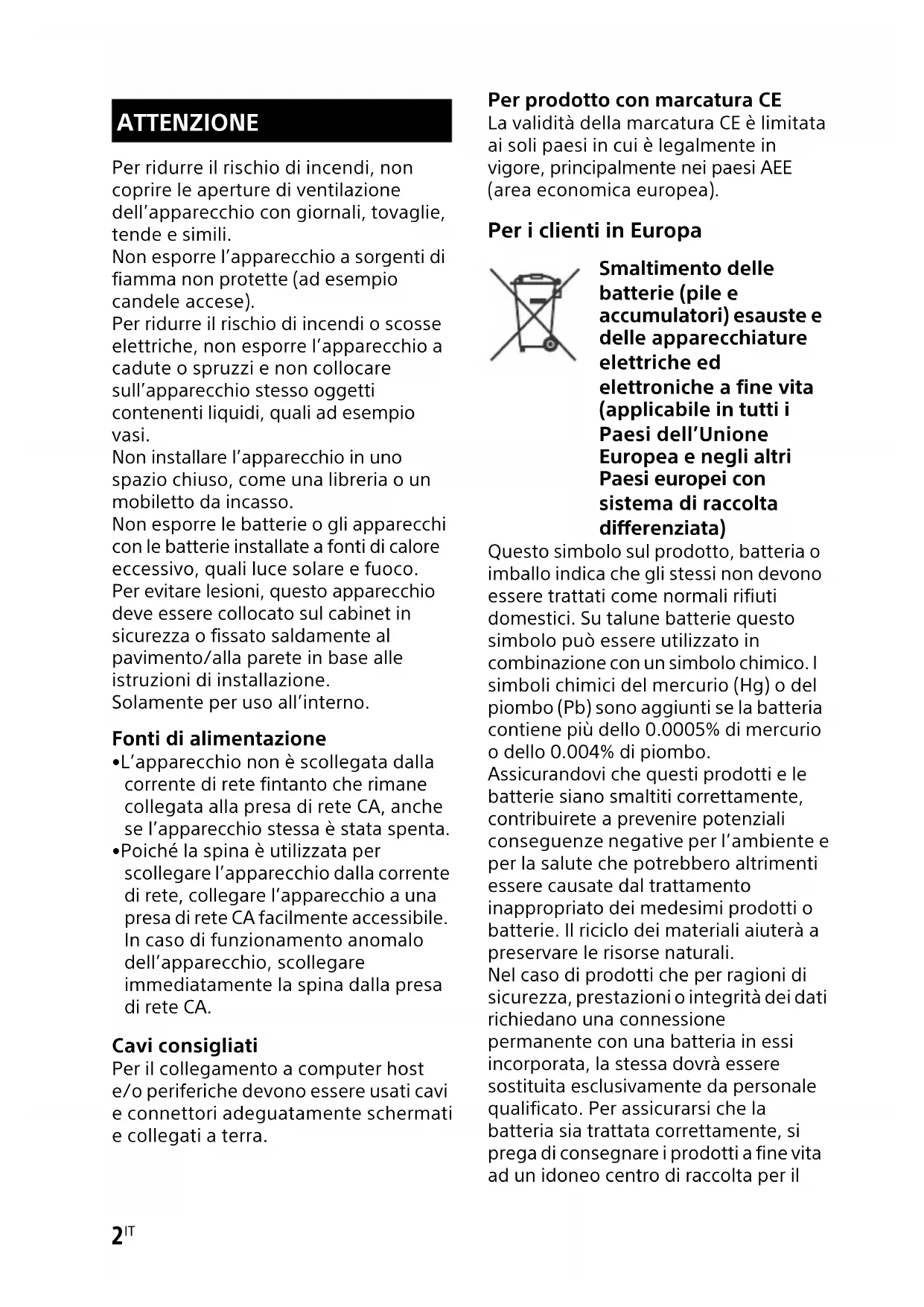 Per ridurre il rischio di incendi, non coprire le aperture di ventilazione dell’apparecchio con giornali, tovaglie, tende e simili. Non esporre l’apparecchio a sorgenti di fiamma non protette (ad esempio candele accese). Per ridurre il rischio di incendi o scosse elettriche, non esporre l’apparecchio a cadute o spruzzi e non collocare sull’apparecchio stesso oggetti contenenti liquidi, quali ad esempio vasi. Non installare l’apparecchio in uno spazio chiuso, come una libreria o un mobiletto da incasso. Non esporre le batterie o gli apparecchi con le batterie installate a fonti di calore eccessivo, quali luce solare e fuoco. Per evitare lesioni, questo apparecchio deve essere collocato sul cabinet in sicurezza o fissato saldamente al pavimento/alla parete in base alle istruzioni di installazione. Solamente per uso all’interno. Fonti di alimentazione