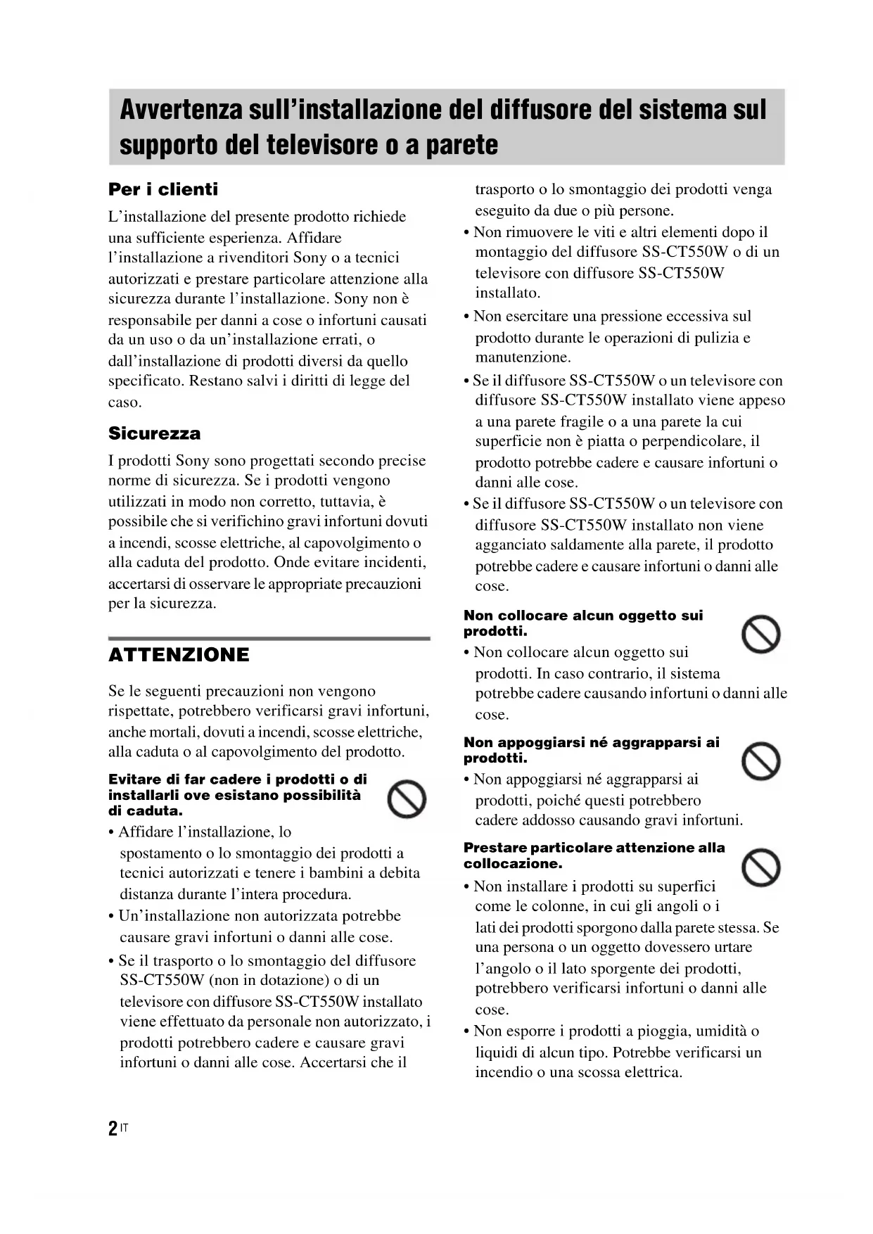 Per i clienti L’installazione del presente prodotto richiede una sufficiente esperienza. Affidare l’installazione a rivenditori Sony o a tecnici autorizzati e prestare particolare attenzione alla sicurezza durante l’installazione. Sony non è responsabile per danni a cose o infortuni causati da un uso o da un’installazione errati, o dall’installazione di prodotti diversi da quello specificato. Restano salvi i diritti di legge del caso. Sicurezza I prodotti Sony sono progettati secondo precise norme di sicurezza. Se i prodotti vengono utilizzati in modo non corretto, tuttavia, è possibile che si verifichino gravi infortuni dovuti a incendi, scosse elettriche, al capovolgimento o alla caduta del prodotto. Onde evitare incidenti, accertarsi di osservare le appropriate precauzioni per la sicurezza. ATTENZIONE Se le seguenti precauzioni non vengono rispettate, potrebbero verificarsi gravi infortuni, anche mortali, dovuti a incendi, scosse elettriche, alla caduta o al capovolgimento del prodotto. Evitare di far cadere i prodotti o di installarli ove esistano possibilità di caduta.