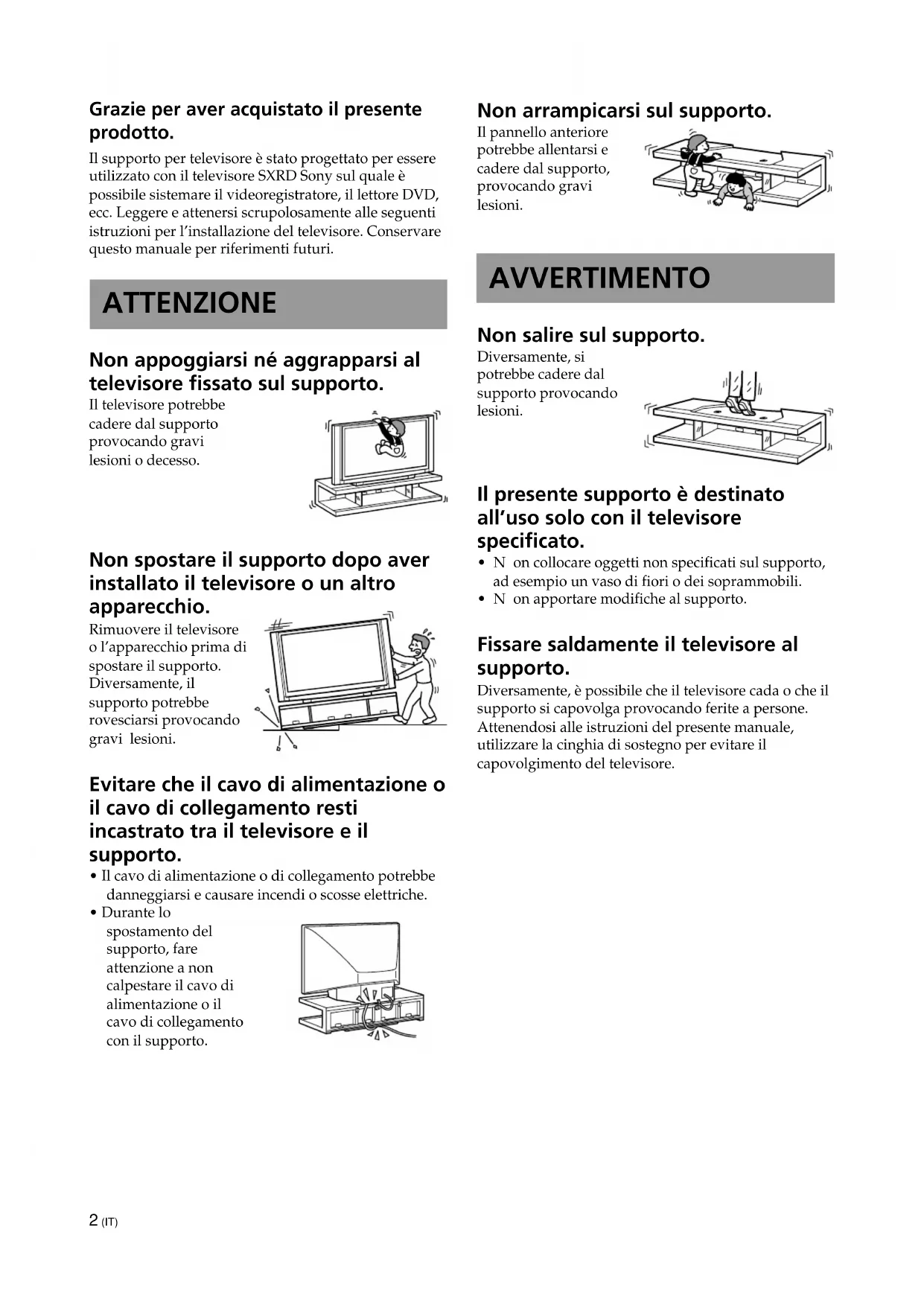 - Durante lo spostamento del supporto, fare attenzione a non calpestare il cavo di alimentazione o il cavo di collegamento con il supporto. Non arrampicarsi sul supporto. Il pannello anteriore potrebbe allentarsi e cadere dal supporto, provocando gravi lesioni. AVVERTIMENTO Non salire sul supporto. Diversamente, si potrebbe cadere dal supporto provocando lesioni. Il presente supporto è destinato all’uso solo con il televisore specificato.