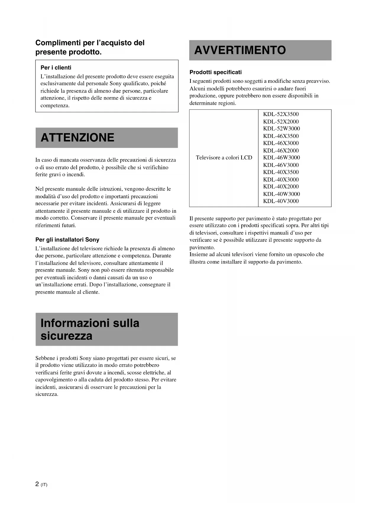 Die Markierungen (C/J) befinden sich wie in der Abbildung oben gezeigt auf der anderen Seite. Konterschraube (S)2 (IT) Complimenti per l’acquisto del presente prodotto. In caso di mancata osservanza delle precauzioni di sicurezza o di uso errato del prodotto, è possibile che si verifichino ferite gravi o incendi. Nel presente manuale delle istruzioni, vengono descritte le modalità d’uso del prodotto e importanti precauzioni necessarie per evitare incidenti. Assicurarsi di leggere attentamente il presente manuale e di utilizzare il prodotto in modo corretto. Conservare il presente manuale per eventuali riferimenti futuri. Per gli installatori Sony L’installazione del televisore richiede la presenza di almeno due persone, particolare attenzione e competenza. Durante l’installazione del televisore, consultare attentamente il presente manuale. Sony non può essere ritenuta responsabile per eventuali incidenti o danni causati da un uso o un’installazione errati. Dopo l’installazione, consegnare il presente manuale al cliente. Sebbene i prodotti Sony siano progettati per essere sicuri, se il prodotto viene utilizzato in modo errato potrebbero verificarsi ferite gravi dovute a incendi, scosse elettriche, al capovolgimento o alla caduta del prodotto stesso. Per evitare incidenti, assicurarsi di osservare le precauzioni per la sicurezza. Prodotti specificati I seguenti prodotti sono soggetti a modifiche senza preavviso. Alcuni modelli potrebbero esaurirsi o andare fuori produzione, oppure potrebbero non essere disponibili in determinate regioni. Il presente supporto per pavimento è stato progettato per essere utilizzato con i prodotti specificati sopra. Per altri tipi di televisori, consultare i rispettivi manuali d’uso per verificare se è possibile utilizzare il presente supporto da pavimento. Insieme ad alcuni televisori viene fornito un opuscolo che illustra come installare il supporto da pavimento. Per i clienti L’installazione del presente prodotto deve essere eseguita esclusivamente dal personale Sony qualificato, poiché richiede la presenza di almeno due persone, particolare attenzione, il rispetto delle norme di sicurezza e competenza. ATTENZIONE Informazioni sulla sicurezza AVVERTIMENTO Televisore a colori LCD KDL-52X3500 KDL-52X2000 KDL-52W3000 KDL-46X3500 KDL-46X3000 KDL-46X2000 KDL-46W3000 KDL-46V3000 KDL-40X3500 KDL-40X3000 KDL-40X2000 KDL-40W3000 KDL-40V30003 (IT) L’installazione dei prodotti deve essere eseguita esclusivamente da personale Sony qualificato. Il televisore e il supporto da pavimento sono molto pesanti, pertanto se l’installazione viene effettuata da persone non qualificate potrebbero verificarsi lesioni gravi. Assicurarsi di prendere le dovute precauzioni in modo che il supporto da pavimento non si capovolga. Diversamente, è possibile che il televisore si capovolga causando ferite. Fissare saldamente il televisore a una parete, colonna e simili onde evitare che si capovolga. Assicurarsi di installare il supporto da pavimento su un pavimento solido e piano. Non installare il supporto da pavimento in modo che penda da un lato, onde evitare che il supporto stesso si capovolga o che il televisore cada provocando ferite a persone o danni. Se il supporto da pavimento viene installato su una superficie morbida quale un tappeto, prima appoggiarvi sopra un pannello. Non utilizzare un supporto da pavimento danneggiato. Non appoggiarsi né aggrapparsi al televisore. Il supporto da pavimento potrebbe capovolgersi, oppure il televisore potrebbe cadere causando ferite gravi o mortali. Impedire ai bambini di salire sul supporto da pavimento o di arrampicarsi sui ripiani. Se i bambini si arrampicano sul supporto da pavimento o giocano tra i ripiani, potrebbero subire lesioni gravi o mortali causate dalla rottura del vetro o dal rovesciamento del supporto da pavimento e del televisore. Non salire sul supporto da pavimento. Si potrebbe cadere oppure rompere il vetro e provocare delle lesioni. Non ostruire le prese di ventilazione del televisore. Se le prese di ventilazione vengono coperte, ad esempio con un panno e simili, il televisore potrebbe surriscaldarsi provocando incendi. Evitare che il cavo di alimentazione o il cavo di collegamento rimangano incastrati.