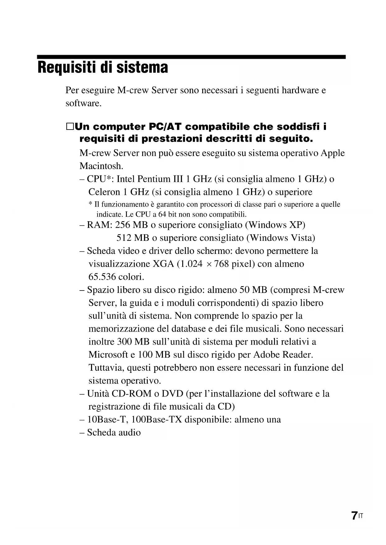 Requisiti di sistema Per eseguire M-crew Server sono necessari i seguenti hardware e software. s Un computer PC/AT compatibile che soddisfi i requisiti di prestazioni descritti di seguito. M-crew Server non può essere eseguito su sistema operativo Apple Macintosh. – CPU*: Intel Pentium III 1 GHz (si consiglia almeno 1 GHz) o Celeron 1 GHz (si consiglia almeno 1 GHz) o superiore