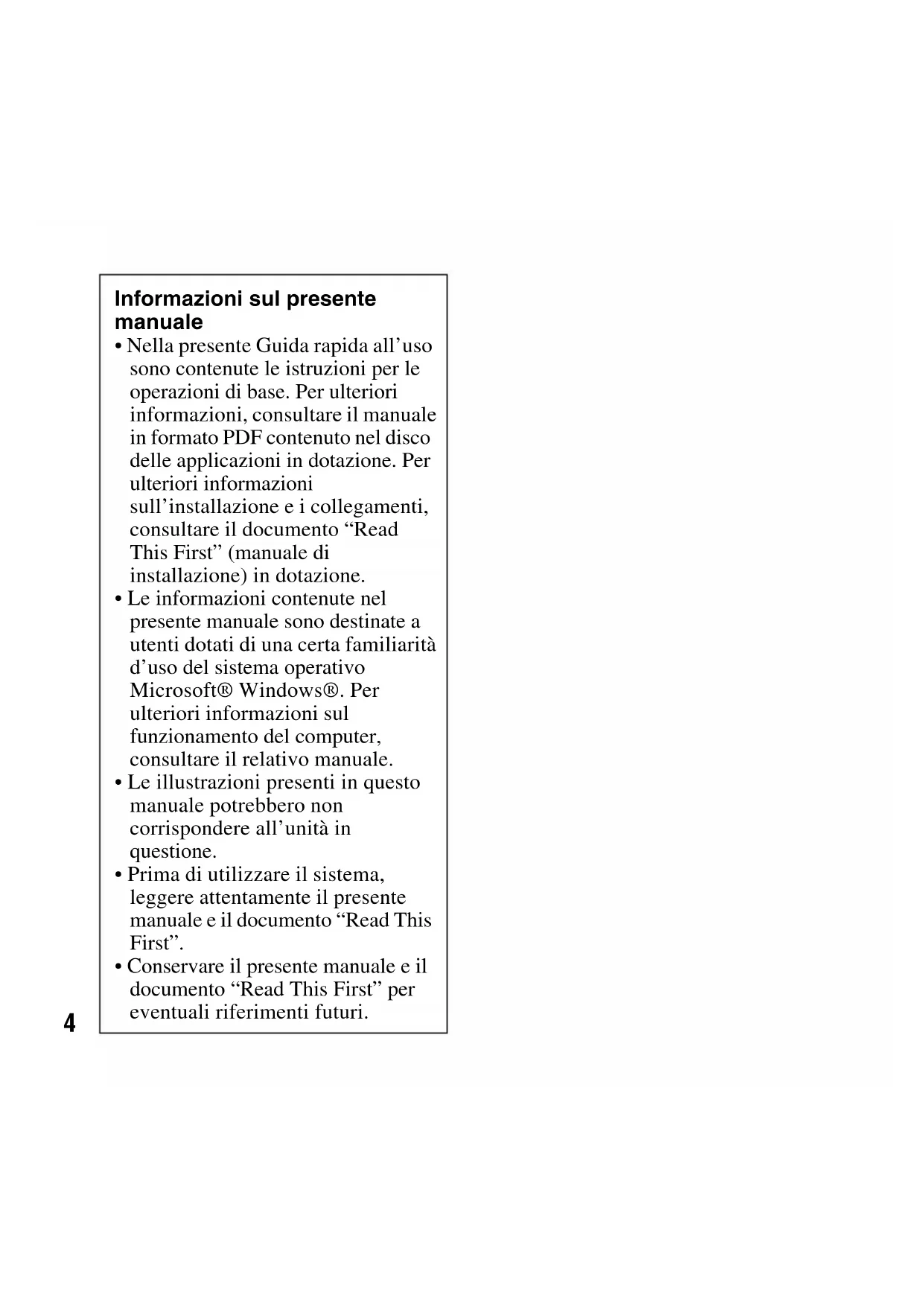 - Nella presente Guida rapida all’uso sono contenute le istruzioni per le operazioni di base. Per ulteriori informazioni, consultare il manuale in formato PDF contenuto nel disco delle applicazioni in dotazione. Per ulteriori informazioni sull’installazione e i collegamenti, consultare il documento “Read This First” (manuale di installazione) in dotazione.