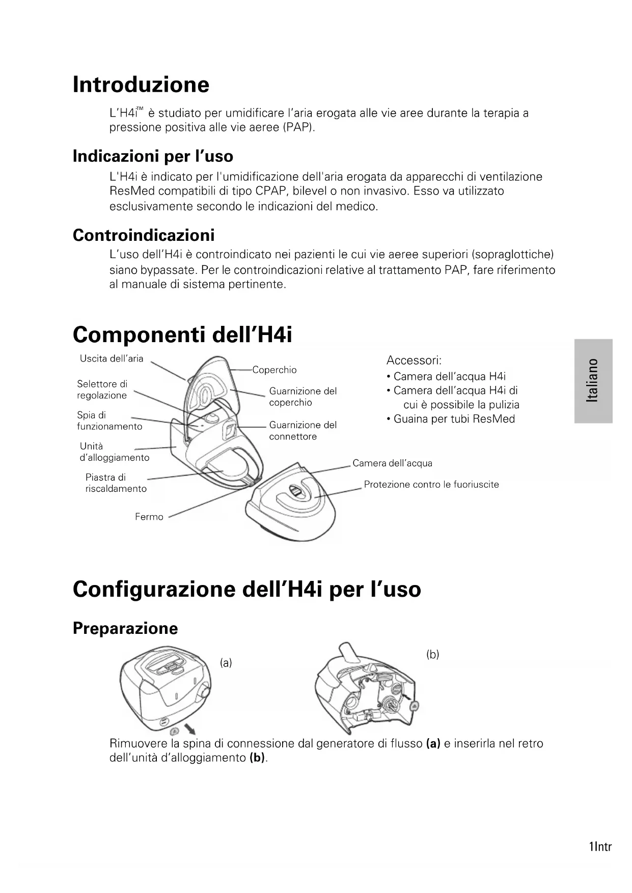 è studiato per umidificare l’aria erogata alle vie aree durante la terapia a pressione positiva alle vie aeree (PAP). Indicazioni per l’uso L'H4i è indicato per l'umidificazione dell'aria erogata da apparecchi di ventilazione ResMed compatibili di tipo CPAP, bilevel o non invasivo. Esso va utilizzato esclusivamente secondo le indicazioni del medico. Controindicazioni L’uso dell’H4i è controindicato nei pazienti le cui vie aeree superiori (sopraglottiche) siano bypassate. Per le controindicazioni relative al trattamento PAP, fare riferimento al manuale di sistema pertinente. Componenti dell’H4i Configurazione dell’H4i per l’uso Preparazione Rimuovere la spina di connessione dal generatore di flusso (a) e inserirla nel retro dell’unità d’alloggiamento (b). Guarnizione del coperchioCoperchioGuarnizione del connettoreUscita dell’ariaFermoPiastra di riscaldamentoCamera dell’acquaUnità d’alloggiamentoSelettore di regolazione Accessori: