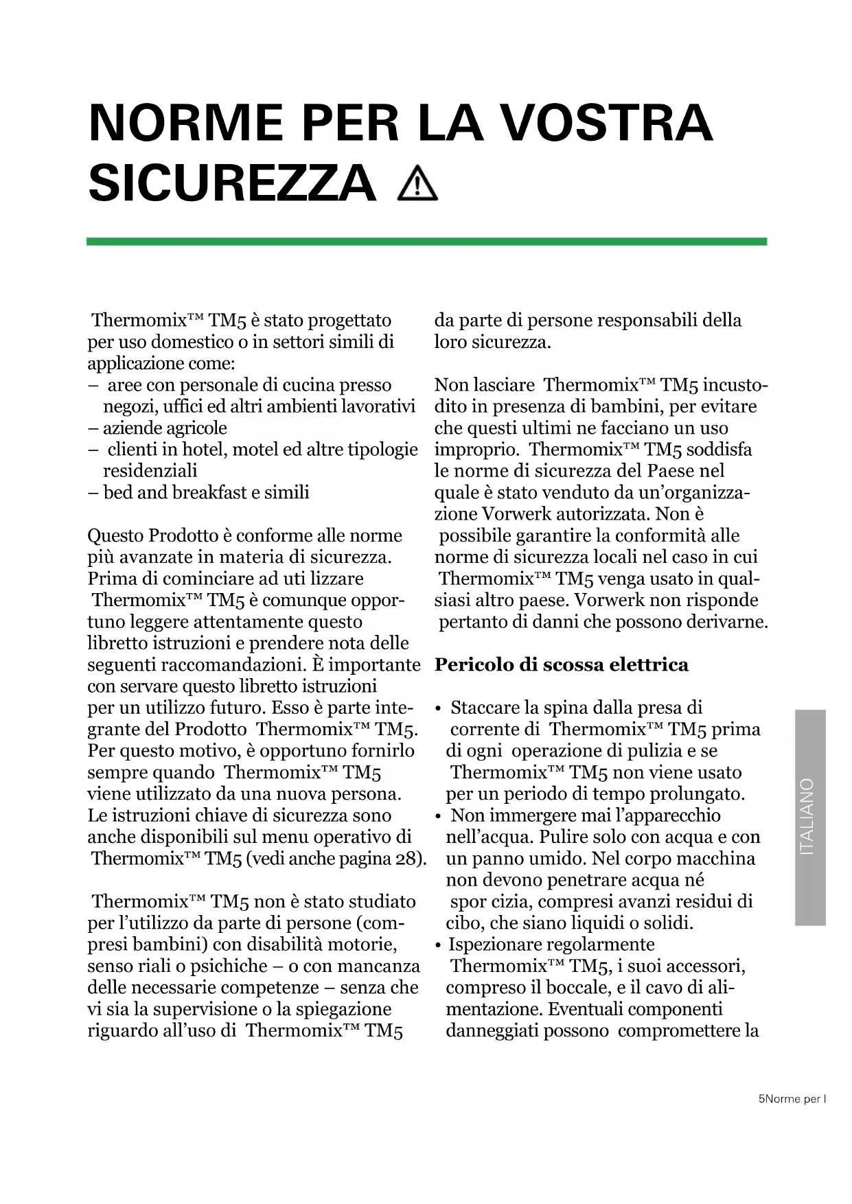 - Da corrosione: fare attenzione ad asciugare completamente i contatti del boccale dopo la pulizia del boccale a mano o in lavastoviglie, in modo tale che nessuna umidità possa entrare nel Thermomix™ TM5 attraverso contatti. Norme per la vostra sicurezza ITALIANO10 Caratteristiche tecniche Marchi di conformità Motore Motore universale Vorwerk esente da manutenzione, 500 W carico nominale. Regolazione graduale numero giri da 100 a 10.200 al minuto (funzione rimescolamento delicato: 40 giri/minuto; Turbo 10.700 giri/minuto)). Velocità speciale per impastare (funzionamento a intermittenza). Protezione da sovraccarico mediante salvamotore. Riscaldamento Potenza assorbita 1000 W. Protezione da surriscaldamento. Bilancia incorporata da 0 a 3000 g ad incrementi di 5 g (fino ad un massimo di 6 kg) da 0 a –3000 g ad incrementi di 5 g (fino ad un massimo di –6 kg). Involucro High-quality plastic material. Boccale Acciaio inossidabile, con sistema di riscaldamento e sensore di temperatura integrati. Capienza massima 2,2 litri. Valore allacciamento Soltanto per corrente alternata 220 … 240 V 50/60 Hz (TM5-2). Assorbimento massimo 1500 W. Cavo alimentazione estraibile, lunghezza 1 m. Dimensioni e peso Thermomix™TM5 Varoma escluso Varoma Altezza 34,1 cm Altezza 13,1 cm Larghezza 32,6 cm Larghezza 38,3 cm Profondità 32,6 cm Profondità 27,5 cm Peso 7,95 kg Peso 0,8 kg CARATTERISTICHE TECNICHE11Introduzione Gentile Cliente, congratulazioni per aver scelto Thermomix™ TM5! Assistendo alla Dimostrazione Thermomix™ TM5, avrà sicuramente iniziato ad apprezzare molti dei benefici di Thermomix™ TM5. Dando fiducia all’esperienza del Suo Incaricato alla Vendita Thermomix™, avrà avuto modo di capire come la versatilità del nostro Prodotto sia in grado di soddisfare tutti i Suoi specifici bisogni alimentari. È ora giunto il momento di provare in prima persona tutti i vantaggi che Thermomix™ TM5 ha in serbo per Lei. Da questo momento, preparare gustose e sane prelibatezze sarà facile e veloce. Cucinare con Thermomix™ TM5 Le consentirà di risparmiare tempo prezioso, da dedicare alle attività che più Le piacciono. Questo libretto istruzioni La condurrà passo dopo passo nel mondo Thermomix™ TM5. Le raccomandiamo di leggerlo con attenzione. Nel farlo, si potrà accorgere di come tutte le Sue esigenze siano state prese in considerazione, durante la progettazione di questo Prodotto di alta qualità. Anche le nostre ricette, facili e caratterizzate da chiari passaggi di esecuzione, sono state studiate per consentir. Le di ottenere risultati eccellenti, anche senza essere un professionista! Auguriamo a Lei, alla Sua famiglia e ai Suoi ospiti momenti felici con Thermomix™ TM5! Vorwerk Thermomix™ TM5 INTRODUZIONE ITALIANO12 Il vostro Thermomix™TM5 IL VOSTRO THERMOMIx™TM5 Dopo aver aperto il pacco, accertatevi che all’interno ci siano tutti i componenti di Thermomix™ TM5: