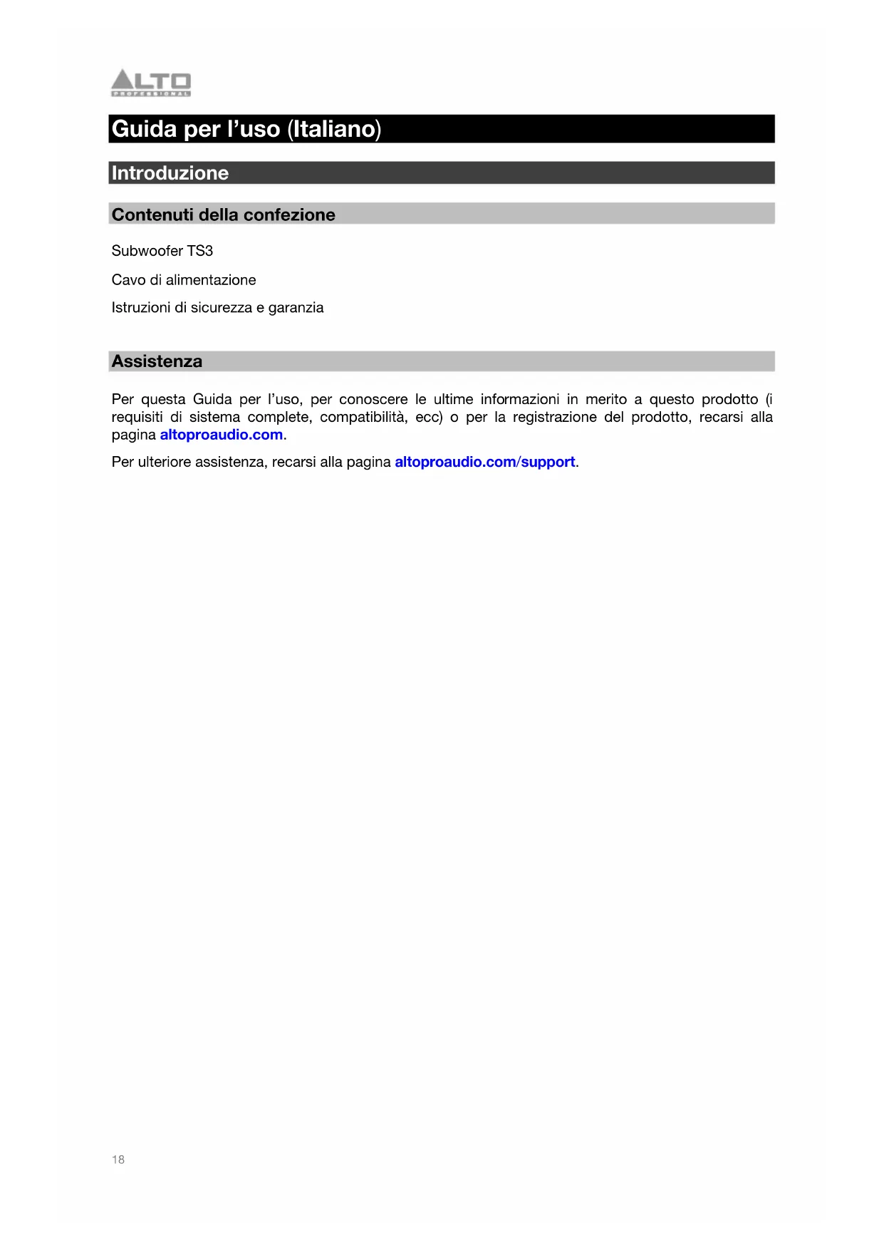 Assistenza Per questa Guida per l’uso, per conoscere le ultime informazioni in merito a questo prodotto (i requisiti di sistema complete, compatibilità, ecc) o per la registrazione del prodotto, recarsi alla pagina altoproaudio.com. Per ulteriore assistenza, recarsi alla pagina altoproaudio.com/support.19