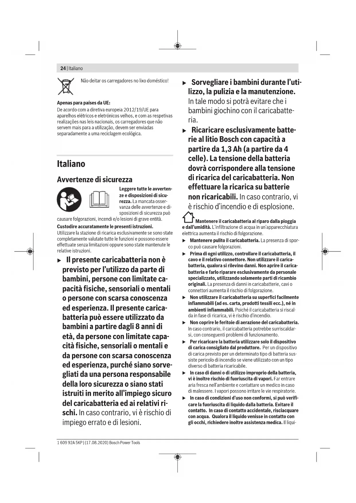 – 4,0 Ah min 23 / 37 – 5,0Ah min 28 / 47 Stazione di ricarica GAL 18V6-80 – 6,0Ah min 32 / 57 Per ulteriori tempi di ricarica consultare il sito www.bosch-professional.com Numero di celle della batteria 4–15 Peso secondo EPTA-Procedure 01:2014 kg 1,8 Classe di protezione / II A) in funzione della temperatura e del tipo di batteria B) Livello di carica della batteria ca. 80%. La batteria può essere prelevata ed utilizzata immediatamente. C) Livello di carica della batteria 95%–100%. Utilizzo Messa in funzione u Attenersi alla tensione di rete La tensione della rete elettrica deve corrispondere ai dati indicati sulla targhetta di identificazione del caricabatteria. I caricabatteria con l’indicazione di 230V possono essere collegati anche alla rete di 220V. Procedura di ricarica Le batterie (1) vengono ricaricate in successione in due cicli di ricarica. – Nel primo ciclo diricarica vengono ricaricate tutte le bat- terie inserite fino all’80%circa della loro capacità. – Nelsecondo ciclo diricarica ha luogo la ricarica dall’80% al100%circa della capacità. Il secondo ciclo diricarica viene avviato quando tutte le batterie inserite sono state ricaricate fino all’80%circa. Accertarsi che tutte le sedi di ricarica (2) e i contatti delle batterie siano privi di sporcizia grossolana. Accertarsi che tutte le batterie siano completamente inserite. Il processo di ricarica ha inizio non appena la spina di alimen- tazione viene inserita nella presa e una batteria viene collo- cata nella stazione di ricarica. Se il processo di ricarica viene avviato con più batterie contemporaneamente, queste ven- gono ricaricate in successione nella direzione della freccia (6) stampata (in senso antiorario). Se la batteria ha un livello di carica superiore all’80% circa, nel primo ciclo di ricarica verrà ignorata e verrà ricaricata nel secondo ciclo di ricarica (dall’80% circa fino al 100% cir- ca). Se durante il secondo ciclo di ricarica (dall’80% circa fi- no al 100% circa) viene inserita una nuova batteria con un li- vello di ricarica inferiore all’80% circa, essa verrà immedia- tamente ricaricata. Quando questa batteria raggiunge l’80% circa della sua carica, la sequenza di caricamento viene nuo- vamente definita. La batteria successiva, che viene caricata nel secondo ciclo di ricarica (da l’80% circa fino al 100% circa),segue la sequenza delle frecce (6) sul caricabatteria (in senso antiorario). Grazie all’intelligente procedimento di ricarica, lo stato di ri- carica della batteria viene riconosciuto automaticamente e l’operazione di ricarica avviene con la rispettiva ottimale cor- Bosch Power Tools 1 609 92A 5KP | (17.08.2020)26 | Italiano rente di carica in base alla temperatura della batteria e della tensione. Questa procedura consente di non sottoporre a sforzi ecces- sivi la batteria che in caso di deposito nel caricabatteria re- sta sempre completamente carica. Avvertenza: La procedura di ricarica sarà possibile soltanto se la temperatura della batteria si troverà nel campo tempe- ratura di ricarica consentito: vedi paragrafo «Dati tecnici». Pulsante Prio (Priority Start) (3) In ciascuna sede di ricarica (2) è presente un pulsante Prio (3) per l’avvio immediato del processo di ricarica nella sede specifica. – Dopo una singola pressione del pulsante Prio (3) la batteria presente in questa sede di ricarica vie- ne ricaricata con priorità fino all’80% circa della sua ca- pacità (primo ciclo di ricarica). All’avvio del processo di ri- carica si illuminano brevemente i primi quattro LED dell’indicatore verde del livello di ricarica della batteria (4). Se il livello di carica della batteria è pari all’80% cir- ca, la batteria successiva viene ricaricata nella direzione della freccia(6) (in senso antiorario). – Con una seconda pressione del pulsante Prio (3) la bat- teria inserita in questa sede per la ricarica verrà ricaricata con priorità fino al 100% circa. All’avvio del processo di ricarica si illuminano brevemente i cinque LED dell’indica- tore verde del livello di ricarica della batteria (4). Una vol- ta completato questo processo di ricarica le altre batterie verranno ricaricate fino a raggiungere l’80% circa della capacità. Se una batteria (1) è stata completamente ricaricata con priorità, si passerà alla batteria nelle sede di ricarica succes- siva. La sequenza di ricarica avviene nel senso della freccia presente (6) sul caricabatteria (in senso antiorario). Significato degli elementi di visualizzazione Indicatore verde del livello di carica della batteria (4) Con l’inserimento della batteria (1) l’indicatore dello stato di carica della batteria visualizza (4). Durante la ricarica, i LED costantemente illuminati mostrano la capacità della batteria ricaricata. I LED che lampeggiano in sequenza uno dopo l’altro (andamento) mostrano la capacità raggiunta con la ricarica. Il LED indicatore di stato è valido per la batteria (1) durante e dopo il processo di ricarica. LED di stato Capacità della batteria, circa Il primo LED si illumina di luce fissa. ≥20% I primi due LED si illuminano di luce fissa. ≥40% I primi tre LED si illuminano di luce fis- sa. ≥60% I primi quattro LED si illuminano di lu- ce fissa. ≥80% LED di stato Capacità della batteria, circa I cinque LED si illuminano di luce fis- sa. >95% Avvertenza: La procedura di ricarica sarà possibile soltanto se la temperatura della batteria si troverà nel campo tempe- ratura di ricarica consentito: vedi paragrafo «Dati tecnici». Nella modalità standby della sede di ricarica (2) il primo LED del relativo indicatore del livello di carica della batteria (4) si illuminerà in modo duraturo di verde. Indicatore rosso monitoraggio temperatura/errori (5) Luce permanente La luce fissa rossa segnala che la temperatura della batteria è oltre l’intervallo di temperatura della ricarica ammesso, vedere paragrafo «Dati tecnici». Non appena viene raggiunto il campo di 