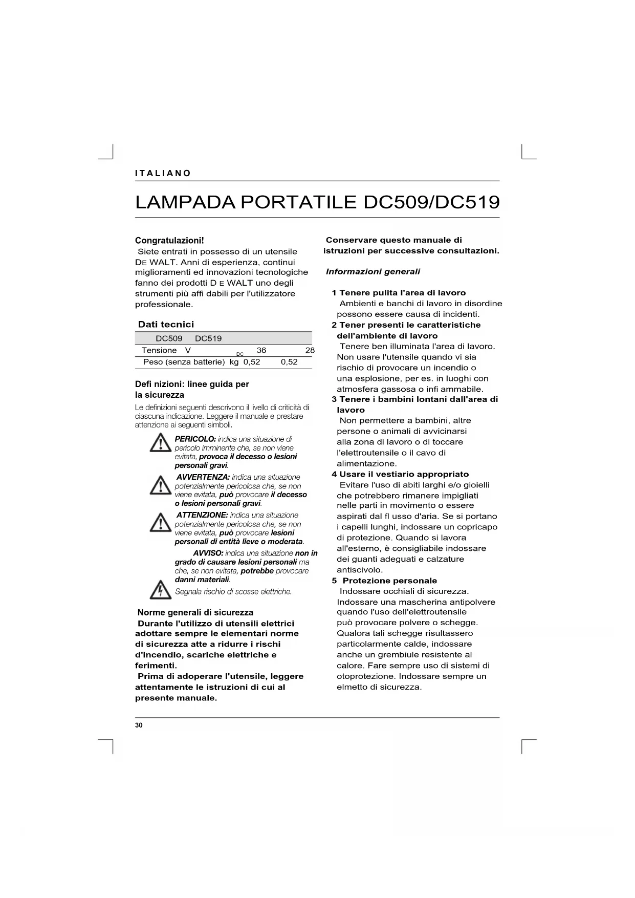 - Leggere a fondo, con calma e con la massima attenzione il presente manuale prima di mettere in funzione l'utensile. Descrizione (fi g. A) AVVERTENZA: non modifi care mai la lampada portatile o alcuna delle sue parti. Potrebbe dar luogo a danni o a lesioni personali. UTILIZZO PREVISTO Le lampade portatili per utilizzo industriale DC509 e DC519 sono progettate per funzionare con gruppi batterie da 36 V o da 28 V e possono essere usate come attrezzi portatili o da tavolo. NON utilizzare sul bagnato o in presenza di liquidi o gas infi ammabili. NON lasciare che i bambini entrino in contatto con l’utensile. È necessaria una supervisione quando questo utensile è usato da personale inesperto. 1 Interruttore acceso/spento 2 Base 3 Tubo fl essibile 4 Testa 5 Lente 6 Supporto della lente 7 Gruppo batterie (non incluso) Sicurezza elettrica Verifi care sempre che la tensione del gruppo batterie corrisponda alla tensione riportata sulla targhetta nominale. Verifi care che la tensione del caricabatterie corrisponda a quella della rete elettrica.