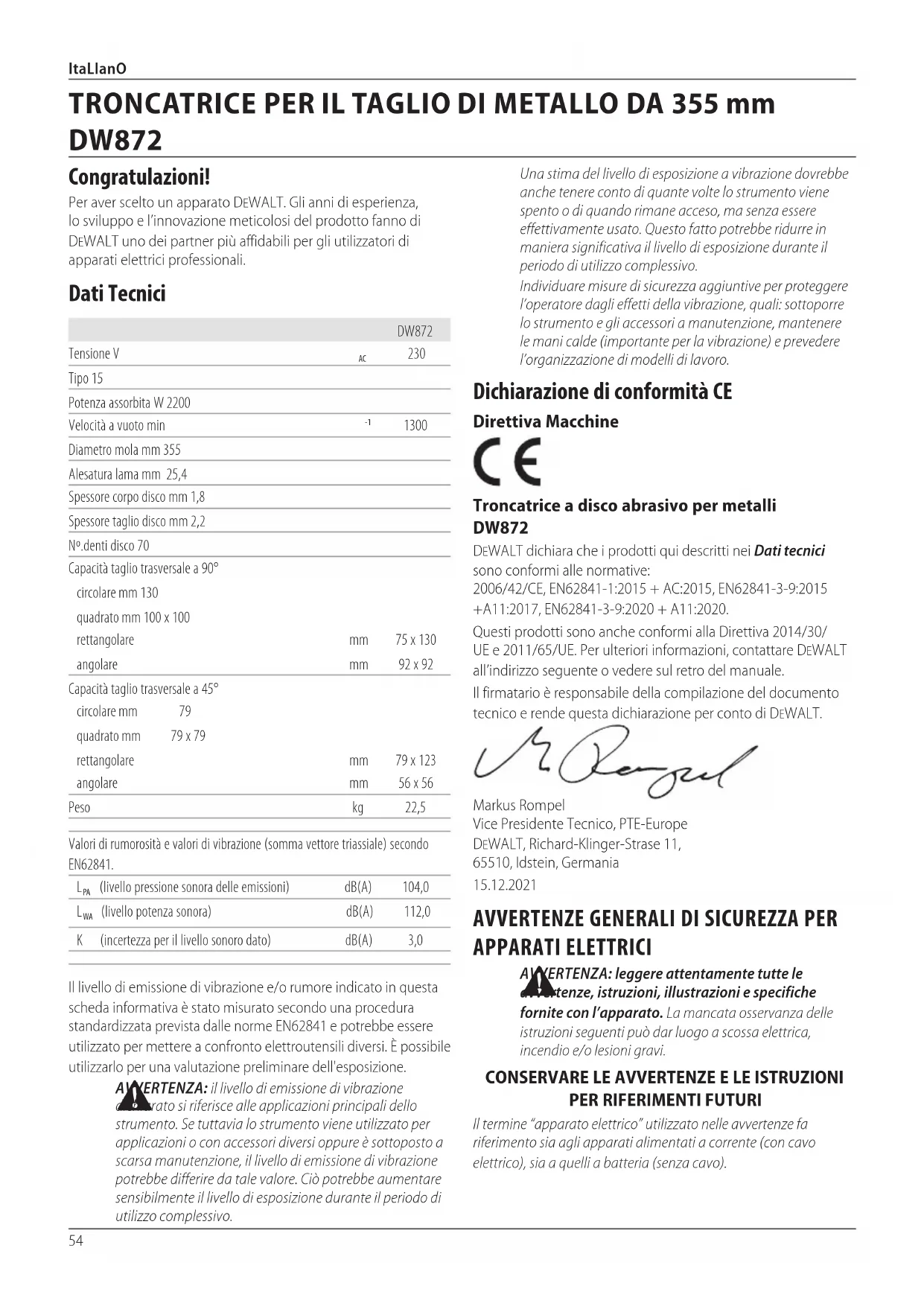 PER RIFERIMENTIFUTURI Il termine “apparato elettrico” utilizzato nelle avvertenze fa riferimento sia agli apparati alimentati a corrente (con cavo elettrico), sia a quelli a batteria (senzacavo). Dichiarazione di conformità CE Direttiva Macchine Troncatrice a disco abrasivo per metalli DW872 DeWALT dichiara che i prodotti qui descritti nei Dati tecnici sono conformi alle normative: 2006/42/CE, EN62841-1:2015 + AC:2015, EN62841-3-9:2015 +A11:2017, EN62841-3-9:2020 + A11:2020. Questi prodotti sono anche conformi alla Direttiva 2014/30/ UE e 2011/65/UE. Per ulteriori informazioni, contattare DeWALT all’indirizzo seguente o vedere sul retro delmanuale. Il firmatario è responsabile della compilazione del documento tecnico e rende questa dichiarazione per conto diDeWALT. Markus Rompel Vice Presidente Tecnico, PTE-Europe DeWALT, Richard-Klinger-Strase 11, 65510, Idstein, Germania