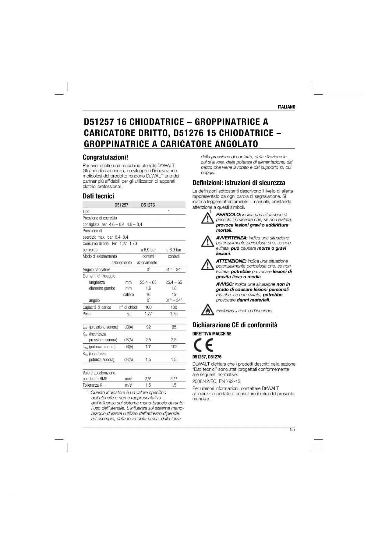 Questo indicatore è un valore specifico dell’utensile e non è rappresentativo dell’influenza sul sistema mano-braccio durante l’uso dell’utensile. L’influenza sul sistema mano- braccio durante l’utilizzo dell’attrezzo dipende, ad esempio, dalla forza della presa, dalla forza della pressione di contatto, dalla direzione in cui si lavora, dalla potenza di alimentazione, dal pezzo che viene lavorato e dal supporto su cui poggia. Defi nizioni: istruzioni di sicurezza Le definizioni sottostanti descrivono il livello di allerta rappresentato da ogni parola di segnalazione. Si invita a leggere attentamente il manuale, prestando attenzione a questi simboli. PERICOLO: indica una situazione di pericolo imminente che, se non evitata, provoca lesioni gravi o addirittura mortali. AVVERTENZA: indica una situazione potenzialmente pericolosa che, se non evitata, può causare morte o gravi lesioni. ATTENZIONE: indica una situazione potenzialmente pericolosa che, se non evitata, potrebbe provocare lesioni di gravità lieve o media. AVVISO: indica una situazione non in grado di causare lesioni personali ma che, se non evitata, potrebbe provocare danni materiali. Evidenzia il rischio d’incendio. Dichiarazione CE di conformità DIRETTIVA MACCHINE D51257, D51276 DEWALT dichiara che i prodotti descritti nella sezione “Dati tecnici” sono stati progettati conformemente alle seguenti normative: 2006/42/EC, EN 792-13. Per ulteriori informazioni, contattare DEWALT all’indirizzo riportato o consultare il retro del presente manuale.