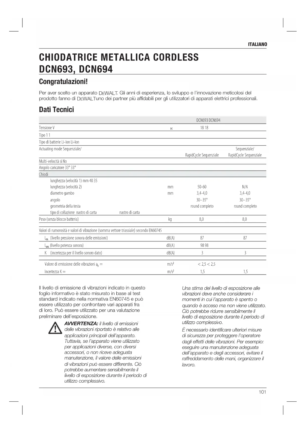 italiano Per aver scelto un apparato DeWALT . Gli anni di esperienza, lo sviluppo e l’innovazione meticolosi del prodotto fanno di DeWALT uno dei partner più affidabili per gli utilizzatori di apparati elettrici professionali. Dati Tecnici DCN693 DCN694 Tensione V