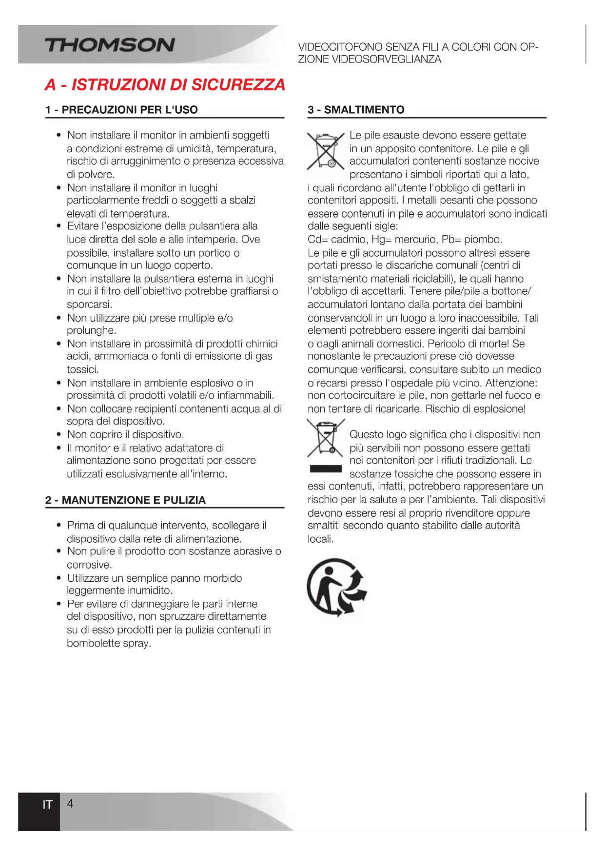 Le pile esauste devono essere gettate in un apposito contenitore. Le pile e gli accumulatori contenenti sostanze nocive presentano i simboli riportati qui a lato, i quali ricordano all'utente l'obbligo di gettarli in contenitori appositi. I metalli pesanti che possono essere contenuti in pile e accumulatori sono indicati dalle seguenti sigle: Cd= cadmio, Hg= mercurio, Pb= piombo. Le pile e gli accumulatori possono altresì essere portati presso le discariche comunali (centri di smistamento materiali riciclabili), le quali hanno l'obbligo di accettarli. Tenere pile/pile a bottone/ accumulatori lontano dalla portata dei bambini conservandoli in un luogo a loro inaccessibile. Tali elementi potrebbero essere ingeriti dai bambini o dagli animali domestici. Pericolo di morte! Se nonostante le precauzioni prese ciò dovesse comunque verificarsi, consultare subito un medico o recarsi presso l'ospedale più vicino. Attenzione: non cortocircuitare le pile, non gettarle nel fuoco e non tentare di ricaricarle. Rischio di esplosione! Questo logo significa che i dispositivi non più servibili non possono essere gettati nei contenitori per i rifiuti tradizionali. Le sostanze tossiche che possono essere in essi contenuti, infatti, potrebbero rappresentare un rischio per la salute e per l’ambiente. Tali dispositivi devono essere resi al proprio rivenditore oppure smaltiti secondo quanto stabilito dalle autorità locali. Pour en savoir plus : www.quefairedemesdechets.frVIDEOCITOFONO SENZA FILI A COLORI CON OP- ZIONE VIDEOSORVEGLIANZA