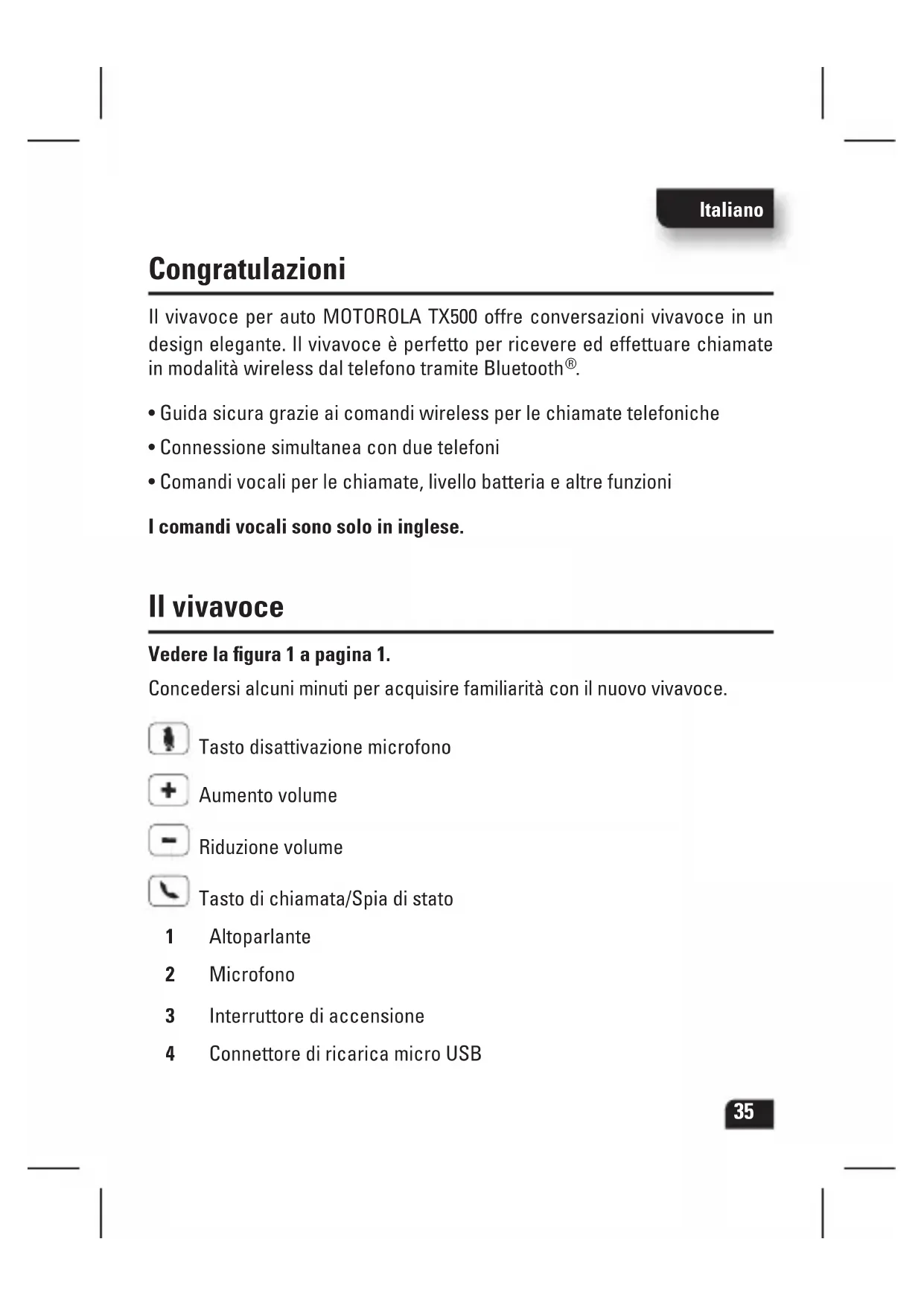 - Comandi vocali per le chiamate, livello batteria e altre funzioni I comandi vocali sono solo in inglese. Il vivavoce Vedere la figura 1 a pagina 1. Concedersi alcuni minuti per acquisire familiarità con il nuovo vivavoce. Tasto disattivazione microfono Aumento volume Riduzione volume Tasto di chiamata/Spia di stato 1 Altoparlante 2 Microfono 3 Interruttore di accensione 4 Connettore di ricarica micro USBItaliano