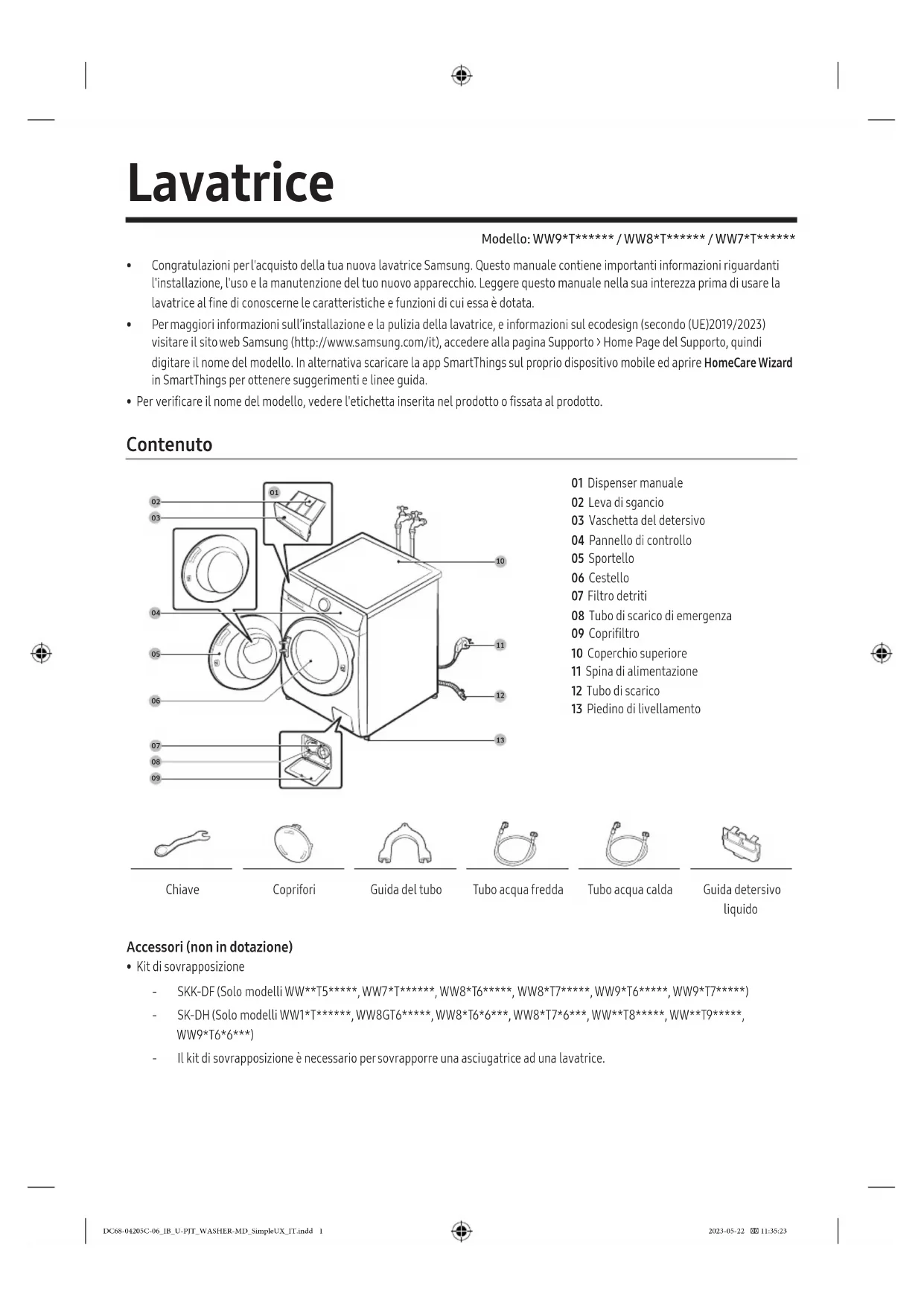 - Kit di sovrapposizione ‐ SKK-DF (Solo modelli WW**T5*****, WW7*T******, WW8*T6*****, WW8*T7*****, WW9*T6*****, WW9*T7*****) ‐ SK-DH (Solo modelli WW1*T******, WW8GT6*****, WW8*T6*6***, WW8*T7*6***, WW**T8*****, WW**T9*****, WW9*T6*6***) ‐ Il kit di sovrapposizione è necessario per sovrapporre una asciugatrice ad una lavatrice. DC68-04205C-06_IB_U-PJT_WASHER-MD_SimpleUX_IT.indd 1 2023-05-22 11:35:23Italiano2 Informazioni di sicurezza NOTA