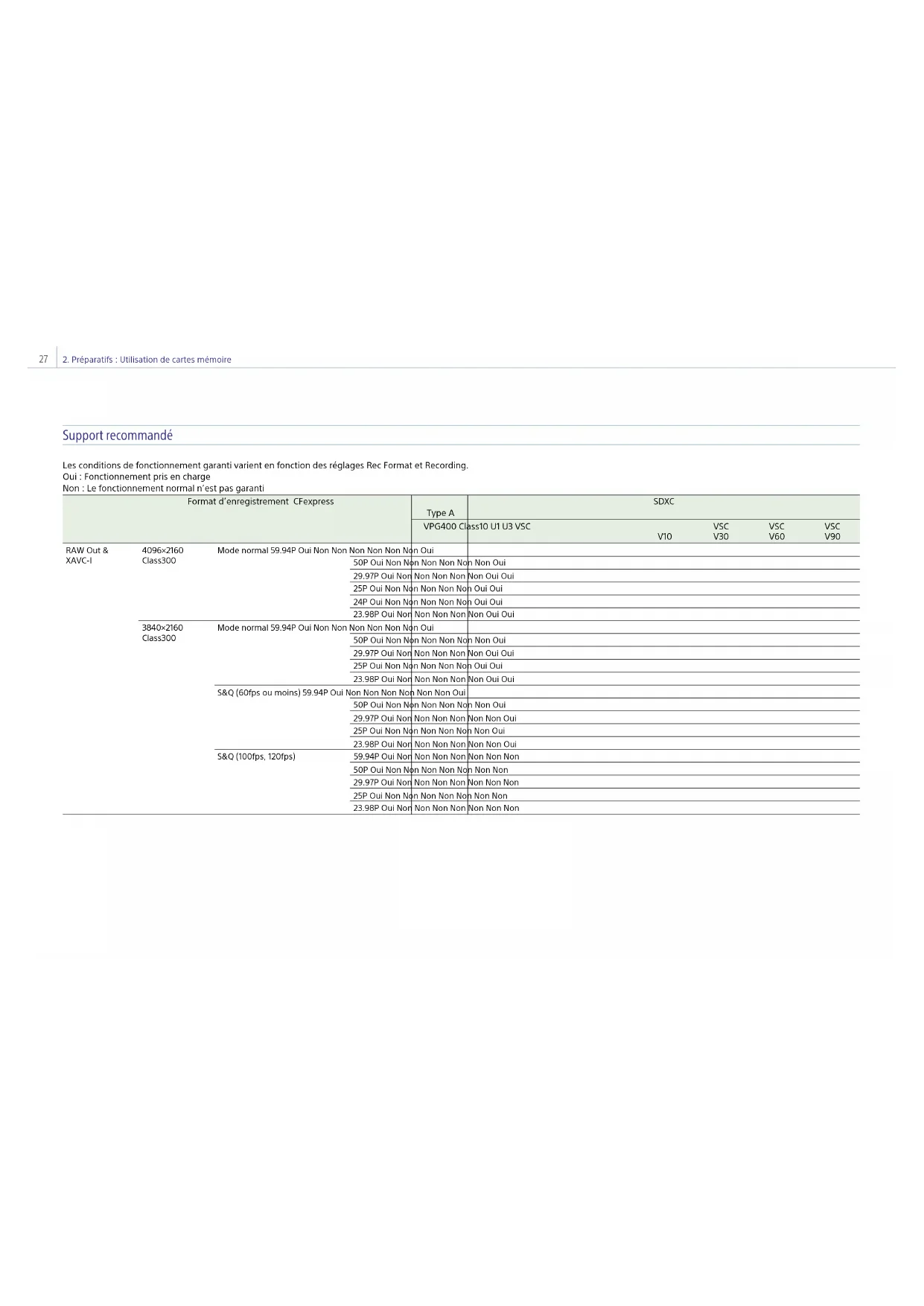 Support recommandé Les conditions de fonctionnement garanti varient en fonction des réglages Rec Format et Recording. Oui : Fonctionnement pris en charge Non : Le fonctionnement normal n’est pas garanti Format d’enregistrement CFexpress Type A SDXC VPG400 Class10 U1 U3 VSC V10 VSC V30 VSC V60 VSC V90 RAW Out & XAVC-I 4096×2160 Class300 Mode normal 59.94P Oui Non Non Non Non Non Non Oui 50P Oui Non Non Non Non Non Non Oui 29.97P Oui Non Non Non Non Non Oui Oui 25P Oui Non Non Non Non Non Oui Oui 24P Oui Non Non Non Non Non Oui Oui 23.98P Oui Non Non Non Non Non Oui Oui 3840×2160 Class300 Mode normal 59.94P Oui Non Non Non Non Non Non Oui 50P Oui Non Non Non Non Non Non Oui 29.97P Oui Non Non Non Non Non Oui Oui 25P Oui Non Non Non Non Non Oui Oui 23.98P Oui Non Non Non Non Non Oui Oui S&Q (60fps ou moins) 59.94P Oui Non Non Non Non Non Non Oui 50P Oui Non Non Non Non Non Non Oui 29.97P Oui Non Non Non Non Non Non Oui 25P Oui Non Non Non Non Non Non Oui 23.98P Oui Non Non Non Non Non Non Oui S&Q (100fps, 120fps) 59.94P Oui Non Non Non Non Non Non Non 50P Oui Non Non Non Non Non Non Non 29.97P Oui Non Non Non Non Non Non Non 25P Oui Non Non Non Non Non Non Non 23.98P Oui Non Non Non Non Non Non Non2. Préparatifs : Utilisation de cartes mémoire