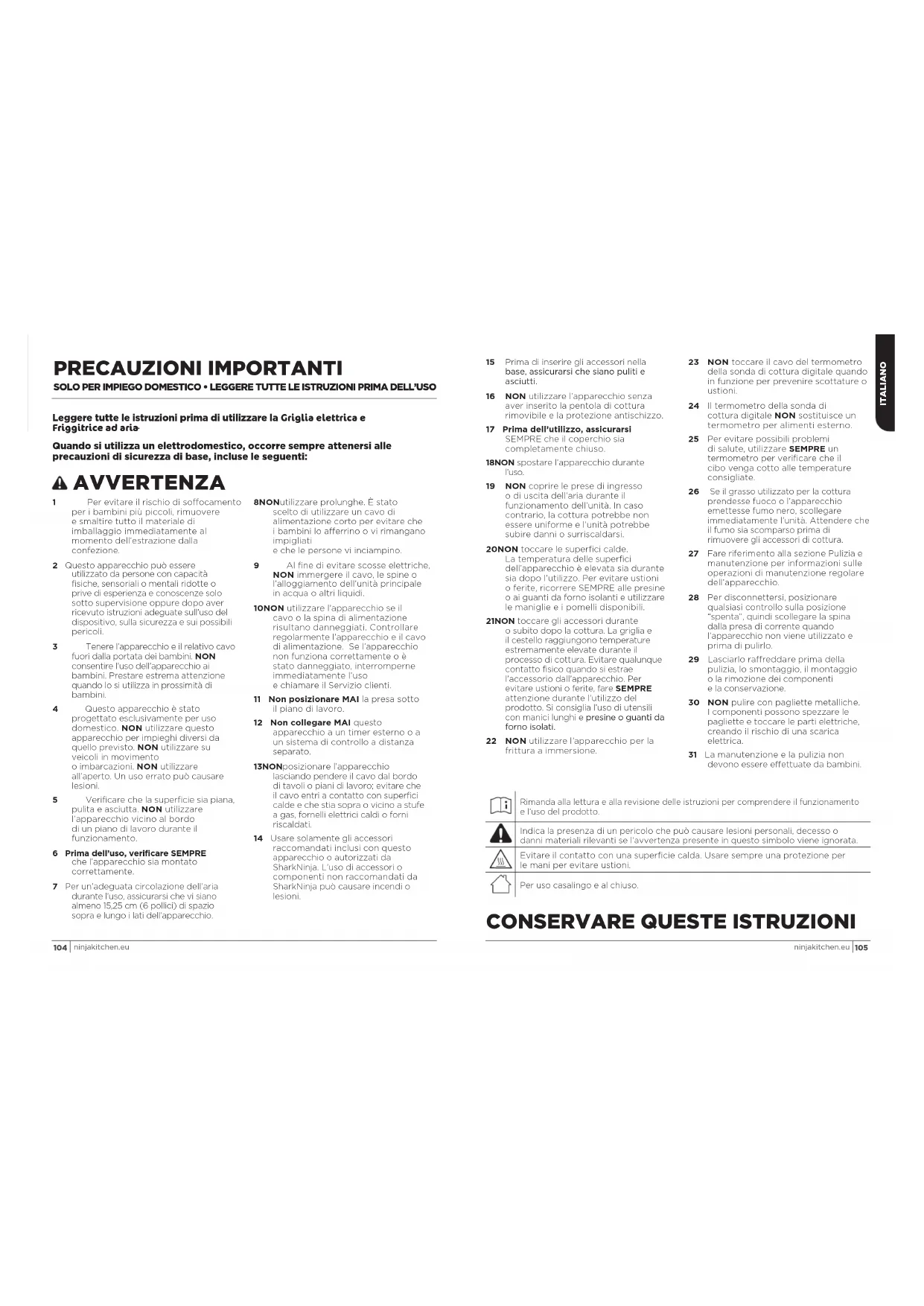 Quando si utilizza un elettrodomestico, occorre sempre attenersi alle precauzioni di sicurezza di base, incluse le seguenti: AVVERTENZA 1 Per evitare il rischio di soffocamento per i bambini più piccoli, rimuovere e smaltire tutto il materiale di imballaggio immediatamente al momento dell’estrazione dalla confezione. 2 Questo apparecchio può essere utilizzato da persone con capacità fisiche, sensoriali o mentali ridotte o prive di esperienza e conoscenze solo sotto supervisione oppure dopo aver ricevuto istruzioni adeguate sull’uso del dispositivo, sulla sicurezza e sui possibili pericoli. 3 Tenere l’apparecchio e il relativo cavo fuori dalla portata dei bambini. NON consentire l’uso dell’apparecchio ai bambini. Prestare estrema attenzione quando lo si utilizza in prossimità di bambini. 4 Questo apparecchio è stato progettato esclusivamente per uso domestico. NON utilizzare questo apparecchio per impieghi diversi da quello previsto. NON utilizzare su veicoli in movimento o imbarcazioni. NON utilizzare all’aperto. Un uso errato può causare lesioni. 5 Verificare che la superficie sia piana, pulita e asciutta. NON utilizzare l’apparecchio vicino al bordo di un piano di lavoro durante il funzionamento. 6 Prima dell’uso, verificare SEMPRE che l’apparecchio sia montato correttamente. 7 Per un’adeguata circolazione dell’aria durante l’uso, assicurarsi che vi siano almeno 15,25cm (6pollici) di spazio sopra e lungo i lati dell’apparecchio. 8 NON utilizzare prolunghe. È stato scelto di utilizzare un cavo di alimentazione corto per evitare che i bambini lo afferrino o vi rimangano impigliati e che le persone vi inciampino. 9 Al fine di evitare scosse elettriche, NON immergere il cavo, le spine o l’alloggiamento dell’unità principale in acqua o altri liquidi. 10 NON utilizzare l’apparecchio se il cavo o la spina di alimentazione risultano danneggiati. Controllare regolarmente l’apparecchio e il cavo di alimentazione. Se l’apparecchio non funziona correttamente o è stato danneggiato, interromperne immediatamente l’uso e chiamare il Servizio clienti. 11 Non posizionare MAI la presa sotto il piano di lavoro. 12 Non collegare MAI questo apparecchio a un timer esterno o a un sistema di controllo a distanza separato. 13 NON posizionare l’apparecchio lasciando pendere il cavo dal bordo di tavoli o piani di lavoro; evitare che il cavo entri a contatto con superfici calde e che stia sopra o vicino a stufe a gas, fornelli elettrici caldi o forni riscaldati. 14 Usare solamente gli accessori raccomandati inclusi con questo apparecchio o autorizzati da SharkNinja. L’uso di accessori o componenti non raccomandati da SharkNinja può causare incendi o lesioni. 15 Prima di inserire gli accessori nella base, assicurarsi che siano puliti e asciutti. 16 NON utilizzare l’apparecchio senza aver inserito la pentola di cottura rimovibile e la protezione antischizzo. 17 Prima dell’utilizzo, assicurarsi SEMPRE che il coperchio sia completamente chiuso. 18 NON spostare l’apparecchio durante l’uso. 19 NON coprire le prese di ingresso o di uscita dell’aria durante il funzionamento dell’unità. In caso contrario, la cottura potrebbe non essere uniforme e l’unità potrebbe subire danni o surriscaldarsi. 20 NON toccare le superfici calde. La temperatura delle superfici dell’apparecchio è elevata sia durante sia dopo l’utilizzo. Per evitare ustioni o ferite, ricorrere SEMPRE alle presine o ai guanti da forno isolanti e utilizzare le maniglie e i pomelli disponibili. 21 NON toccare gli accessori durante o subito dopo la cottura. La griglia e il cestello raggiungono temperature estremamente elevate durante il processo di cottura. Evitare qualunque contatto fisico quando si estrae l’accessorio dall’apparecchio. Per evitare ustioni o ferite, fare SEMPRE attenzione durante l’utilizzo del prodotto. Si consiglia l’uso di utensili con manici lunghi e presine o guanti da forno isolati. 22 NON utilizzare l’apparecchio per la frittura a immersione. 23 NON toccare il cavo del termometro della sonda di cottura digitale quando in funzione per prevenire scottature o ustioni. 24 Il termometro della sonda di cottura digitale NON sostituisce un termometro per alimenti esterno. 25 Per evitare possibili problemi di salute, utilizzare SEMPRE un termometro per verificare che il cibo venga cotto alle temperature consigliate.