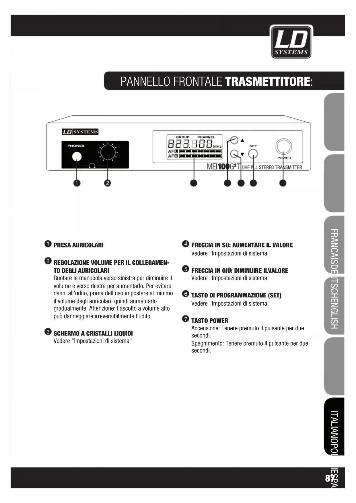 Assenza di audio o volume troppo basso. Ricevitore: display spento. Verificare che le batterie non siano scariche e che il ricevitore sia attivato. Trasmettitore: display spento. Controllare la connessione tra alimentatore e trasmettitore. Accendere il trasmettitore. Ricevitore: è acceso ma la spia RF non è accesa. Assicurarsi che il trasmettitore e il ricevitore siano impostati sulla stessa frequenza. Ridurre la distanza tra trasmettitore e ricevitore e verificare che i due dispositivi si trovino in contatto visivo diretto. Accertarsi che l'antenna del trasmettitore sia montata correttamente. Ricevitore: attivato, la spia RF è accesa. Alzare il volume del ricevitore e controllare il collegamento degli auricolari. Verificare il livello di ingresso del trasmetti- tore ed eventualmente alzarlo. Distorsioni o interfe- renze. Ricevitore: spia RF accesa. Aumentare la distanza dalle possibili cause di interferenza (dispositivi a controllo digita- le, quali lettori CD, computer, consolle…). Utilizzare una radiofrequenza diversa. Distorsione del suono. Ricevitore: simbolo della batteria acceso. Sostituire le batterie con altre nuove. Trasmettitore: indicatore di livello troppo alto Abbassare il volume con i regolatori di livello del trasmettitore o il volume del dispositivo di riproduzione.93 ITALIANOPOLSKIESPAÑOL FRANCAISFRANCAIS FRANCAISFRANCAIS FRANCAISDEUTSCHENGLISH Denominazione del set: LDMEI100G2 Modello del ricevitore portatile: LDMEI100G2BPR Intervallo di frequenza: 823 - 832 MHz e 863 - 865 MHz Canali: 96 (8 gruppi da 12 canali) Modo di trasmissione: FM Stereo Risposta in frequenza: 80 - 15.000 Hz Rapporto segnale/rumore: > 90 dB (A) Fattore di distorsione armonica (THD): 0,50% Uscita audio: Jack stereo da 3,5 mm Livello di uscita audio massimo: 100 mW Dispositivi di comando: Volume, On/Off, Set, tasti freccia (su/giù) Indicatori: Display LC multifunzione, segnale RF Alimentazione: 2 batterie tipo AA Durata d'uso: > 10 ore (dipende dalle batterie) Dimensioni (L x H x P): 65 x 95 x 25 mm Peso: 0,07 kg (senza batterie) Modello del trasmettitore: LDMEI100G2T Intervallo di frequenza ricevitore radio: 823 - 832 MHz e 863 - 865 MHz Canali: 96 (8 gruppi da 12 canali) Modalità di funzionamento: Mono/Stereo Modo di trasmissione: FM Stereo Potenza in uscita ad alta frequenza: 10 mW Risposta in frequenza: 80 - 15.000 Hz Rapporto segnale/rumore: > 90 dB (A) Fattore di distorsione armonica (THD): 0,50% Ingressi: N. 2 XLR / jack da 6,3 mm (combo) Impedenza di ingresso: 100 kOhm Presa dell'antenna: Presa TNC Dispositivi di comando: Accensione (On/Off), Set, tasti freccia (su/giù), volume auricolari, livello audio (livello AF) sinistra/destra, interruttore mono/ stereo Indicatori: Display LC multifunzione Alimentazione: alimentatore esterno Tensione di esercizio: 12 V - 18 V DC, 300 mA Dimensioni (L x H x P): 212 x 38 x 90 mm Peso: 0,57 kg Modello auricolari: LDIEHP1 Tipo: In-Ear Risposta in frequenza: 30 - 20.000 Hz Impedenza: 16 Ohm Collegamento: Jack stereo da 3,5 mm Lunghezza cavo: 1,5 m Poiché i nostri prodotti sono continuamente sottoposti a procedure di sviluppo e miglioramento. le caratteristiche tecniche possono essere soggette a modifiche senza preavviso. DATI TECNICI:94 ENGLISHDEUTSCHFRANCAIS FRANCAISFRANCAIS FRANCAISFRANCAIS ESpAñoLpoLSKIITALIANo DICHIARAZIONI DEL pRODUTTORE: