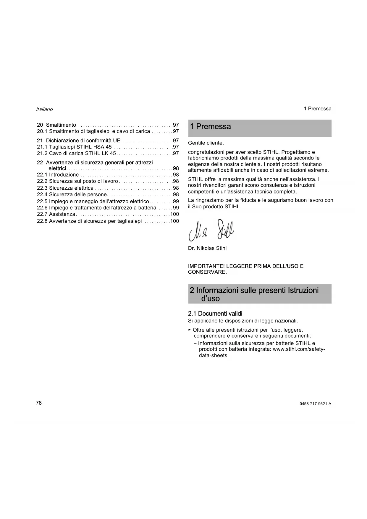 italiano 1 Premessa Gentile cliente, congratulazioni per aver scelto STIHL. Progettiamo e fabbrichiamo prodotti della massima qualità secondo le esigenze della nostra clientela. I nostri prodotti risultano altamente affidabili anche in caso di sollecitazioni estreme. STIHL offre la massima qualità anche nell'assistenza. I nostri rivenditori garantiscono consulenza e istruzioni competenti e un'assistenza tecnica completa. La ringraziamo per la fiducia e le auguriamo buon lavoro con il Suo prodotto STIHL. Dr. Nikolas Stihl