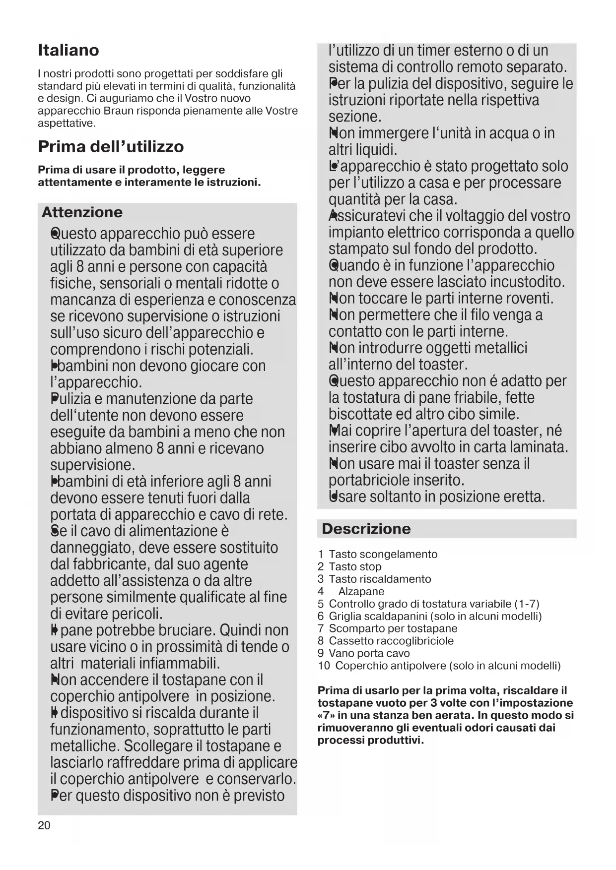 - Retire ocasionalmente a gaveta para migalhas (8) e esvazie-a. 19Italiano I nostri prodotti sono progettati per soddisfare gli standard più elevati in termini di qualità, funzionalità e design. Ci auguriamo che il Vostro nuovo apparecchio Braun risponda pienamente alle Vostre aspettative. Prima dell’utilizzo Prima di usare il prodotto, leggere attentamente e interamente le istruzioni. Attenzione