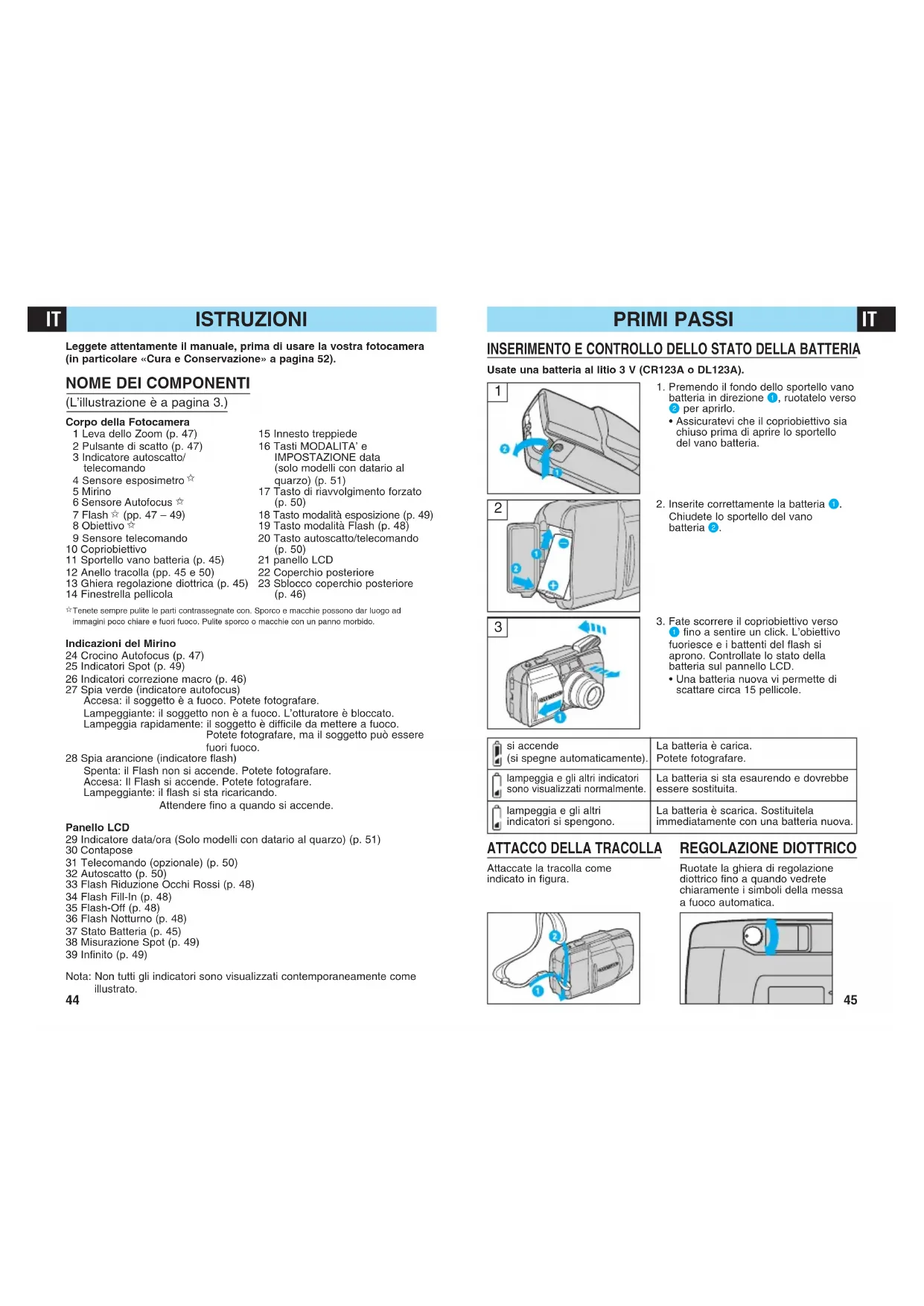 Tenete sempre pulite le parti contrassegnate con. Sporco e macchie possono dar luogo ad immagini poco chiare e fuori fuoco. Pulite sporco o macchie con un panno morbido. Indicazioni del Mirino 24 Crocino Autofocus (p. 47) 25 Indicatori Spot (p. 49) 26 Indicatori correzione macro (p. 46) 27 Spia verde (indicatore autofocus) Accesa: il soggetto è a fuoco. Potete fotografare. Lampeggiante: il soggetto non è a fuoco. L’otturatore è bloccato. Lampeggia rapidamente: il soggetto è difficile da mettere a fuoco. Potete fotografare, ma il soggetto può essere fuori fuoco. 28 Spia arancione (indicatore flash) Spenta: il Flash non si accende. Potete fotografare. Accesa: Il Flash si accende. Potete fotografare. Lampeggiante: il flash si sta ricaricando. Attendere fino a quando si accende. Panello LCD 29 Indicatore data/ora (Solo modelli con datario al quarzo) (p. 51) 30 Contapose 31 Telecomando (opzionale) (p. 50) 32 Autoscatto (p. 50) 33 Flash Riduzione Occhi Rossi (p. 48) 34 Flash Fill-In (p. 48) 35 Flash-Off (p. 48) 36 Flash Notturno (p. 48) 37 Stato Batteria (p. 45) 38 Misurazione Spot (p. 49) 39 Infinito (p. 49) Nota: Non tutti gli indicatori sono visualizzati contemporaneamente come illustrato. 15 Innesto treppiede 16 Tasti MODALITA’ e IMPOSTAZIONE data (solo modelli con datario al quarzo) (p. 51) 17 Tasto di riavvolgimento forzato (p. 50) 18 Tasto modalità esposizione (p. 49) 19 Tasto modalità Flash (p. 48) 20 Tasto autoscatto/telecomando (p. 50) 21 panello LCD 22 Coperchio posteriore 23 Sblocco coperchio posteriore (p. 46) REGOLAZIONE DIOTTRICO Ruotate la ghiera di regolazione diottrico fino a quando vedrete chiaramente i simboli della messa a fuoco automatica.FOTOGRAFIA FUNZIONI STANDARD