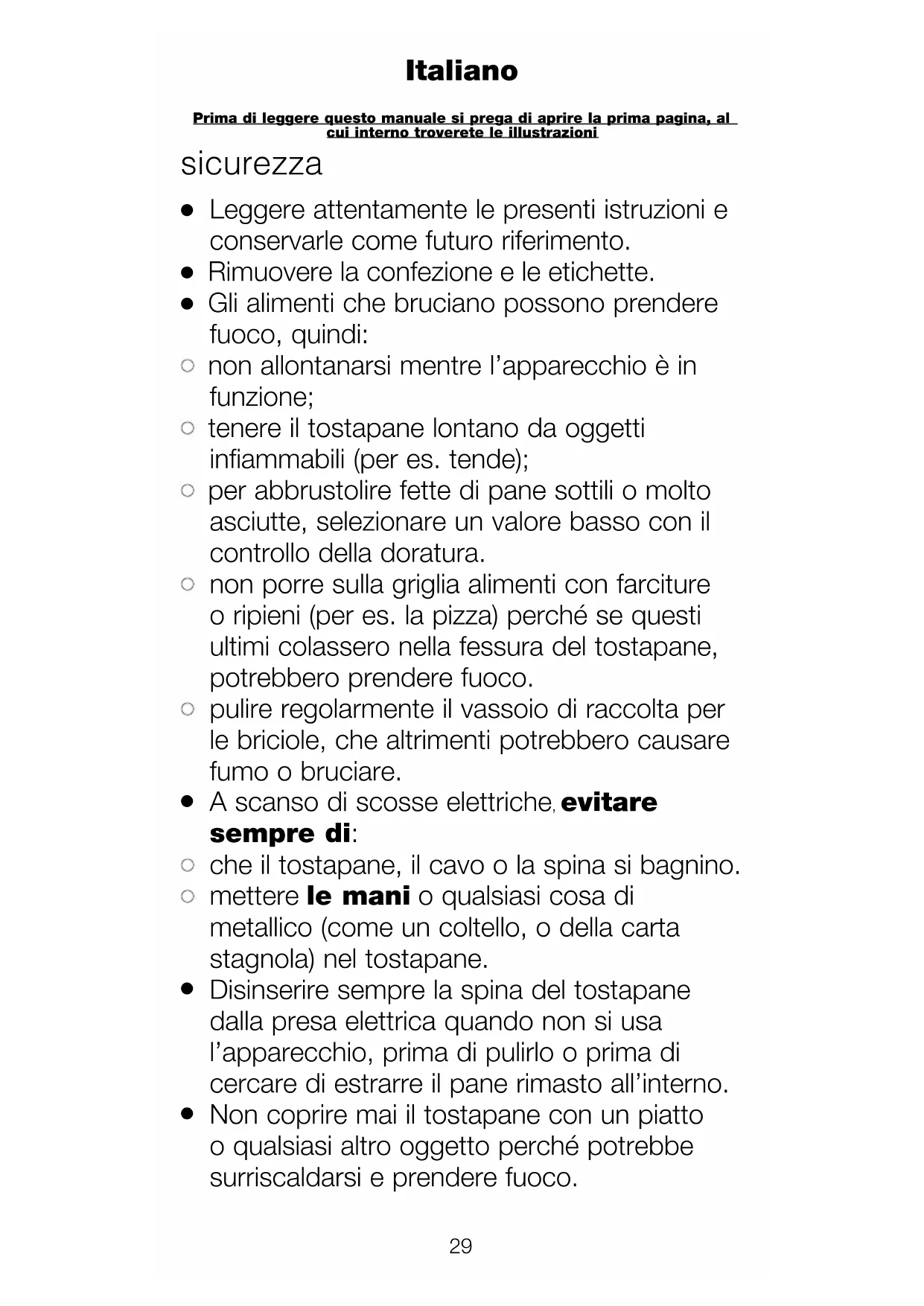 non porre sulla griglia alimenti con farciture o ripieni (per es. la pizza) perché se questi ultimi colassero nella fessura del tostapane, potrebbero prendere fuoco.