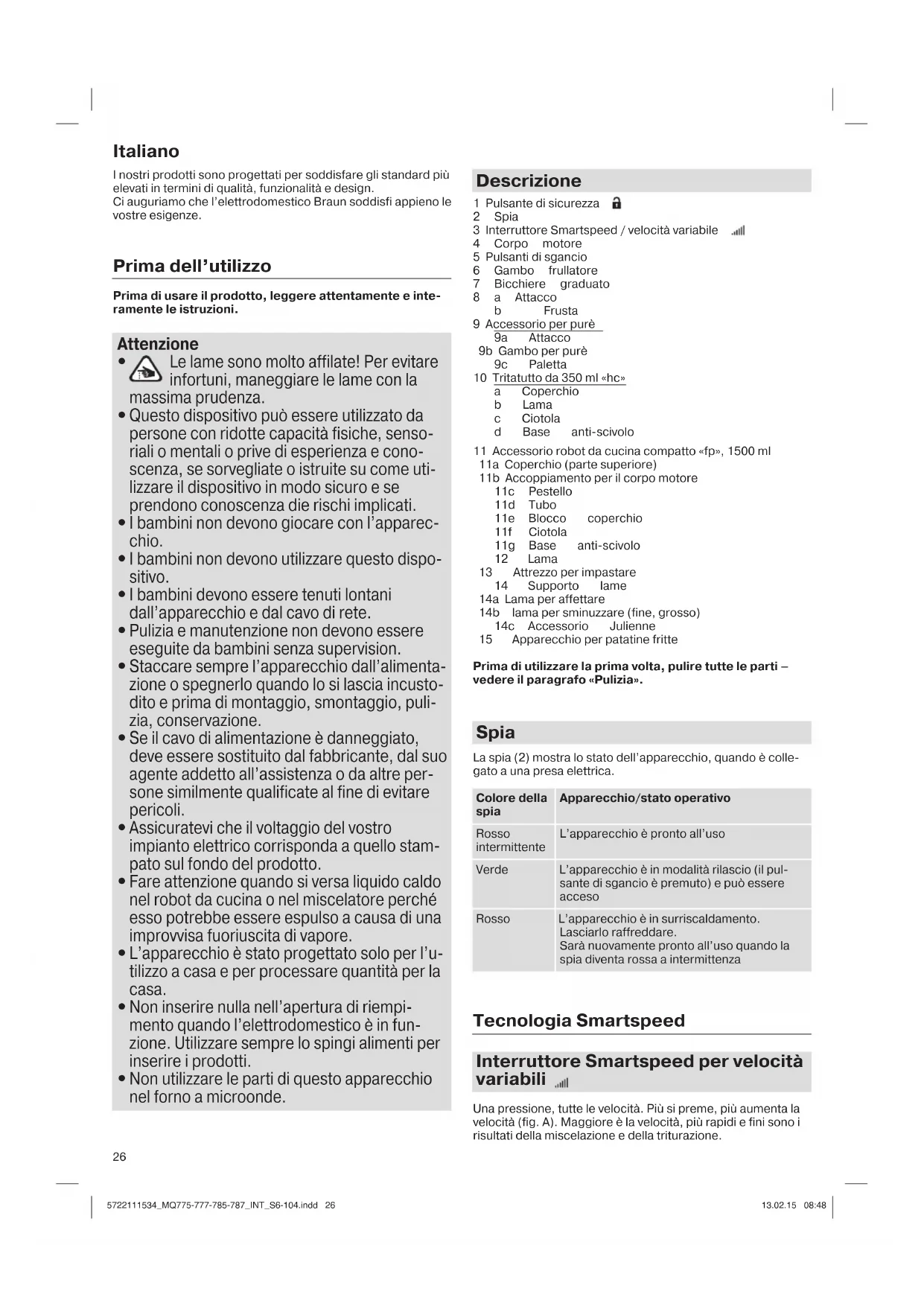 Non utilizzare le parti di questo apparecchio nel forno a microonde. Descrizione 1 Pulsante di sicurezza 2 Spia 3 Interruttore Smartspeed / velocità variabile 4 Corpo motore 5 Pulsanti di sgancio 6 Gambo frullatore 7 Bicchiere graduato 8 a Attacco b Frusta 9 Accessorio per purè 9a Attacco 9b Gambo per purè 9c Paletta 10 Tritatutto da 350 ml «hc» a Coperchio b Lama c Ciotola d Base anti-scivolo 11 Accessorio robot da cucina compatto «fp», 1500 ml 11a Coperchio (parte superiore) 11b Accoppiamento per il corpo motore 11c Pestello 11d Tubo 11e Blocco coperchio 11f Ciotola 11g Base anti-scivolo 12 Lama 13 Attrezzo per impastare 14 Supporto lame 14a Lama per affettare 14b lama per sminuzzare (fine, grosso) 14c Accessorio Julienne 15 Apparecchio per patatine fritte Prima di utilizzare la prima volta, pulire tutte le parti – vedere il paragrafo «Pulizia». Spia La spia (2) mostra lo stato dell’apparecchio, quando è colle- gato a una presa elettrica. Colore della spia Apparecchio/stato operativo Rosso intermittente L’apparecchio è pronto all’uso Verde L’apparecchio è in modalità rilascio (il pul- sante di sgancio è premuto) e può essere acceso Rosso L’apparecchio è in surriscaldamento. Lasciarlo raffreddare. Sarà nuovamente pronto all’uso quando la spia diventa rossa a intermittenza Tecnologia Smartspeed Interruttore Smartspeed per velocità variabili Una pressione, tutte le velocità. Più si preme, più aumenta la velocità (fig. A). Maggiore è la velocità, più rapidi e fini sono i risultati della miscelazione e della triturazione. Italiano 5722111534_MQ775-777-785-787_INT_S6-104.indd 265722111534_MQ775-777-785-787_INT_S6-104.indd 26 13.02.15 08:4813.02.15 08:4827 Funzionamento con una mano: l’interruttore Smartspeed (3) consente di accendere il corpo motore e di controllare la velo- cità con una mano sola. Come utilizzare l’apparecchio Al primo utilizzo: Rimuovere la protezione per il trasporto dal corpo motore (4) tirandola dalla fascetta rossa. Accensione (A) L’apparecchio dispone di un pulsante di sicurezza. Per accenderlo in sicurezza, seguire questa procedura: