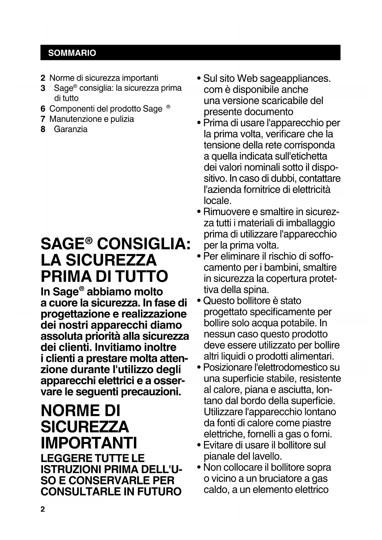 - Non collocare il bollitore sopra o vicino a un bruciatore a gas caldo, a un elemento elettrico 2 Norme di sicurezza importanti 3 Sage