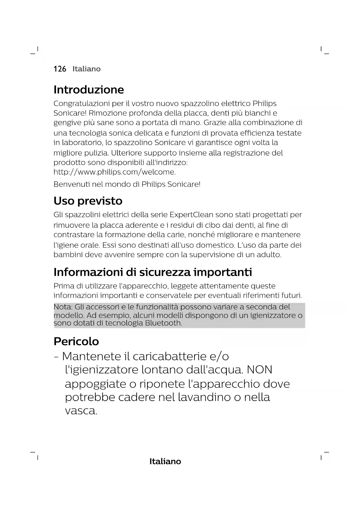 FrançaisItaliano Introduzione Congratulazioni per il vostro nuovo spazzolino elettrico Philips Sonicare! Rimozione profonda della placca, denti più bianchi e gengive più sane sono a portata di mano. Grazie alla combinazione di una tecnologia sonica delicata e funzioni di provata efficienza testate in laboratorio, lo spazzolino Sonicare vi garantisce ogni volta la migliore pulizia. Ulteriore supporto insieme alla registrazione del prodotto sono disponibili all'indirizzo: http://www.philips.com/welcome. Benvenuti nel mondo di Philips Sonicare! Uso previsto Gli spazzolini elettrici della serie ExpertClean sono stati progettati per rimuovere la placca aderente e i residui di cibo dai denti, al fine di contrastare la formazione della carie, nonché migliorare e mantenere l'igiene orale. Essi sono destinati all'uso domestico. L'uso da parte dei bambini deve avvenire sempre con la supervisione di un adulto. Informazioni di sicurezza importanti Prima di utilizzare l'apparecchio, leggete attentamente queste informazioni importantie conservatele per eventuali riferimenti futuri. Nota: Gli accessori e le funzionalità possono variare a seconda del modello. Ad esempio, alcuni modelli dispongono di un igienizzatore o sono dotati di tecnologia Bluetooth. Pericolo - Mantenete il caricabatterie e/o l'igienizzatore lontano dall'acqua. NON appoggiate o riponete l'apparecchio dove potrebbe cadere nel lavandino o nella vasca.