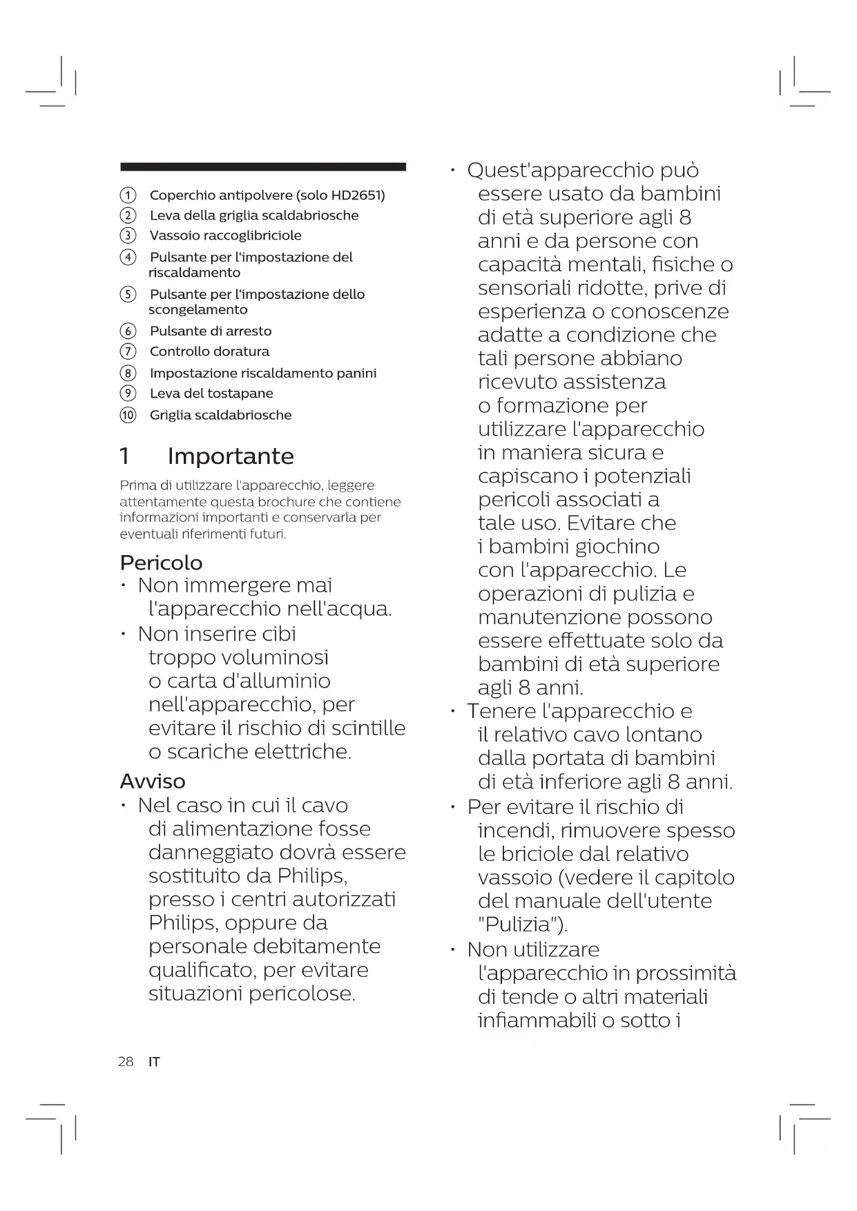 - Non utilizzare l'apparecchio in prossimità di tende o altri materiali inammabili o sotto i a Coperchio antipolvere (solo HD2651) b Leva della griglia scaldabriosche c Vassoio raccoglibriciole d Pulsante per l'impostazione del riscaldamento e Pulsante per l'impostazione dello scongelamento f Pulsante di arresto g Controllo doratura h Impostazione riscaldamento panini i Leva del tostapane j Griglia scaldabriosche 1 Importante Prima di utilizzare l'apparecchio, leggere attentamente questa brochure che contiene informazioni importanti e conservarla per eventuali riferimenti futuri. Pericolo