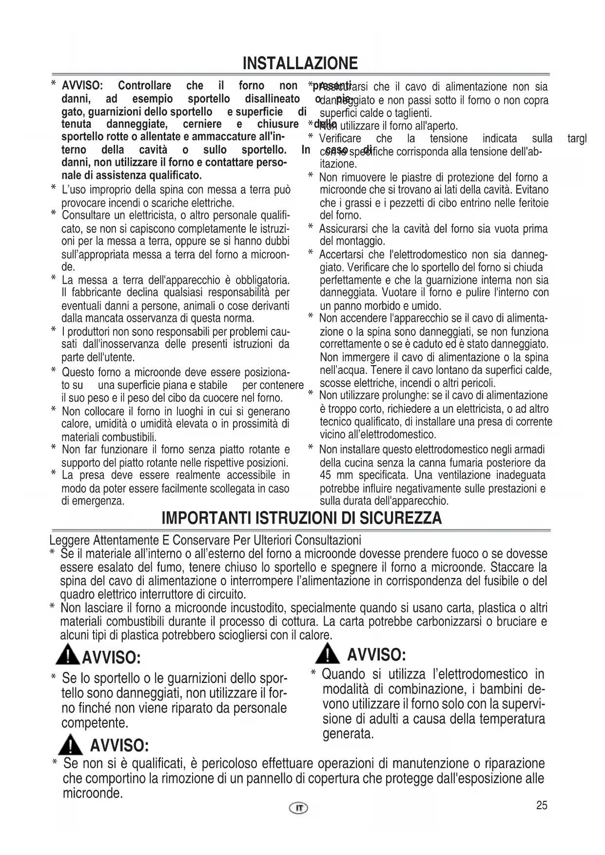 - Gli interventi di assistenza devono essere esclusivamente effettuati da personale tecnico qualificato/autorizzato. Suggeriamo pertanto di non pro- cedere alla rimozione dei pannelli di copertura del forno. Il cavo di alimentazione deve essere sostituito con cavo originale, da personale specializzato dispo- nibile tramite la rete di Centri di Assistenza Autorizzati. Il cavo di alimentazione deve essere sostitui- to solo da personale specializzato.27