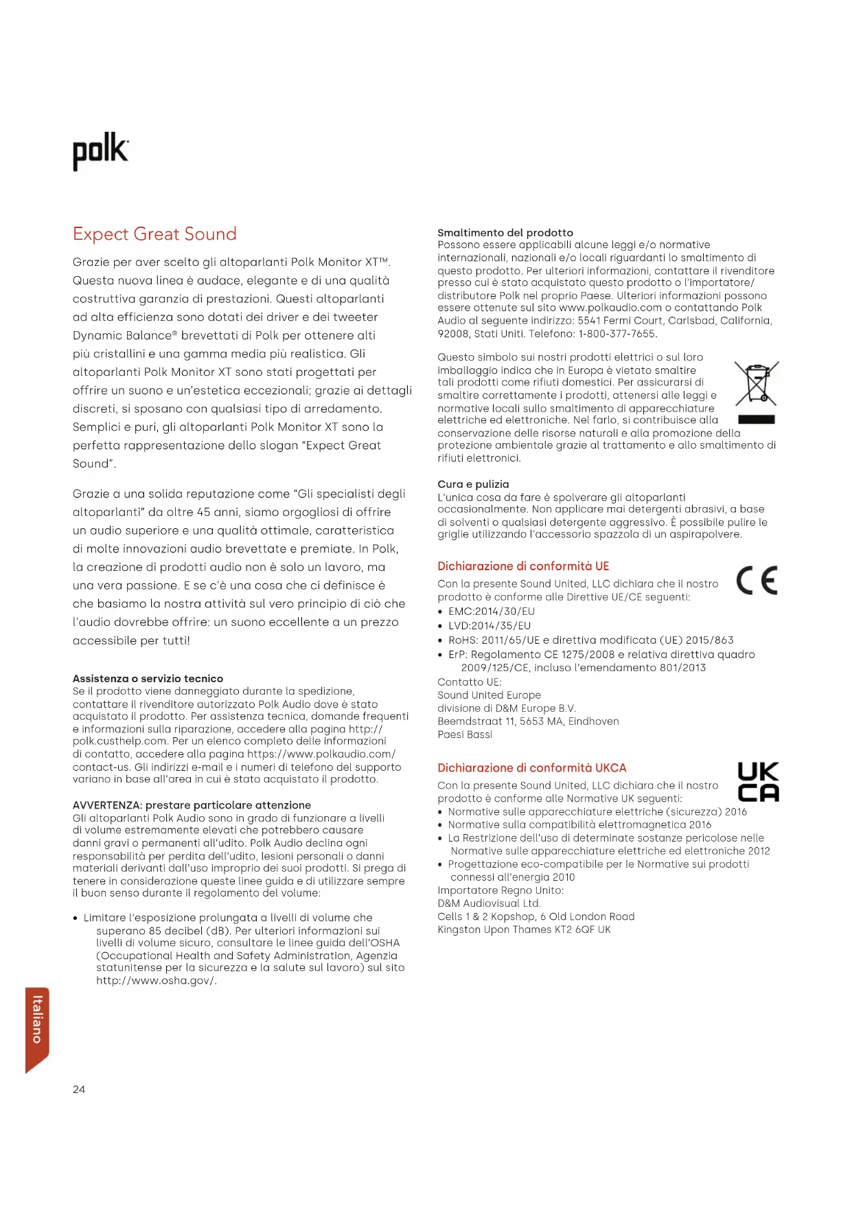 - Limitare l’esposizione prolungata a livelli di volume che superano 85 decibel (dB). Per ulteriori informazioni sui livelli di volume sicuro, consultare le linee guida dell’OSHA (Occupational Health and Safety Administration, Agenzia statunitense per la sicurezza e la salute sul lavoro) sul sito http://www.osha.gov/. Smaltimento del prodotto Possono essere applicabili alcune leggi e/o normative internazionali, nazionali e/o locali riguardanti lo smaltimento di questo prodotto. Per ulteriori informazioni, contattare il rivenditore presso cui è stato acquistato questo prodotto o l’importatore/ distributore Polk nel proprio Paese. Ulteriori informazioni possono essere ottenute sul sito www.polkaudio.com o contattando Polk Audio al seguente indirizzo: 5541 Fermi Court, Carlsbad, California, 92008, Stati Uniti. Telefono: 1-800-377-7655. Questo simbolo sui nostri prodotti elettrici o sul loro imballaggio indica che in Europa è vietato smaltire tali prodotti come rifiuti domestici. Per assicurarsi di smaltire correttamente i prodotti, attenersi alle leggi e normative locali sullo smaltimento di apparecchiature elettriche ed elettroniche. Nel farlo, si contribuisce alla conservazione delle risorse naturali e alla promozione della protezione ambientale grazie al trattamento e allo smaltimento di rifiuti elettronici. Cura e pulizia L’unica cosa da fare è spolverare gli altoparlanti occasionalmente. Non applicare mai detergenti abrasivi, a base di solventi o qualsiasi detergente aggressivo. È possibile pulire le griglie utilizzando l’accessorio spazzola di un aspirapolvere. Dichiarazione di conformità UE Con la presente Sound United, LLC dichiara che il nostro prodotto è conforme alle Direttive UE/CE seguenti: