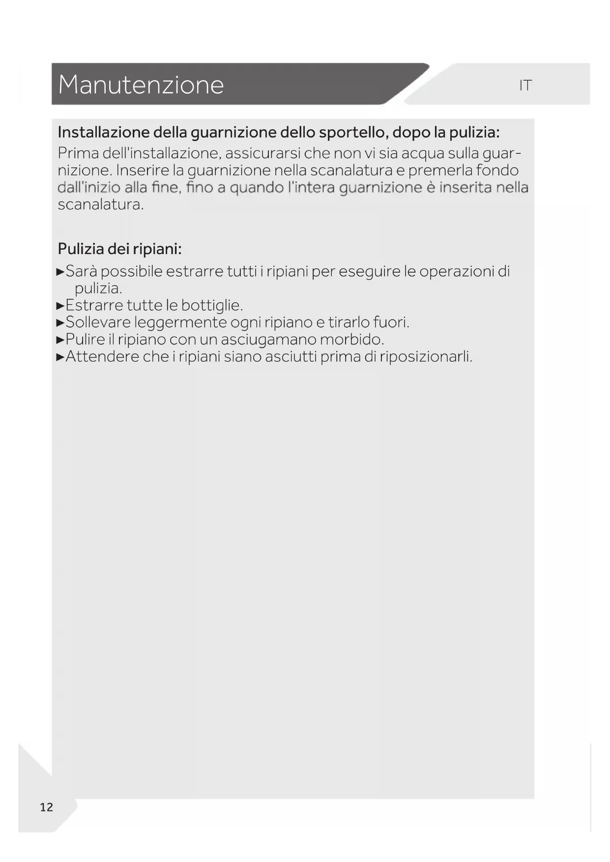 VXSHUnjFLHGHOODJXDUQL]LRQHGHOODSRUWDFRQXQDVFLXJDPDQRLP- EHYXWRGLDFTXDRDOFRRODOLPHQWDUH,QnjQHODYDUHODJXDUQL]LRQH GHOODSRUWDHDVFLXJDUODFRQXQSDQQRSXOLWR 11IT Manutenzione Installazione della guarnizione dello sportello, dopo la pulizia: Prima dell'installazione, assicurarsi che non vi sia acqua sulla guar- nizione. Inserire la guarnizione nella scanalatura e premerla fondo scanalatura. Pulizia dei ripiani: ▶ Sarà possibile estrarre tutti i ripiani per eseguire le operazioni di pulizia. ▶ Estrarre tutte le bottiglie. ▶ Sollevare leggermente ogni ripiano e tirarlo fuori. ▶ Pulire il ripiano con un asciugamano morbido. ▶ Attendere che i ripiani siano asciutti prima di riposizionarli. 12IT Accessori Controllare gli accessori e la documentazione conformemente al presente elenco: senza isolazione.