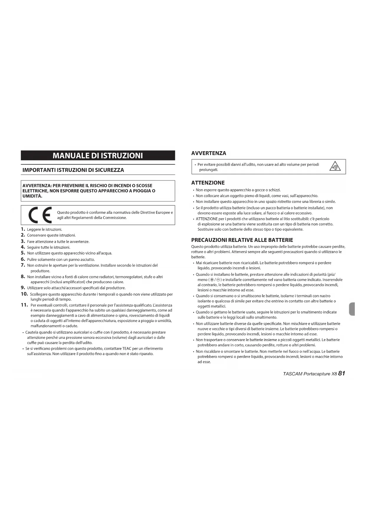 Questo prodotto utilizza batterie. Un uso improprio delle batterie potrebbe causare perdite, rotture o altri problemi. Attenersi sempre alle seguenti precauzioni quando si utilizzano le batterie.• Mai ricaricare batterie non ricaricabili. Le batterie potrebbero rompersi o perdere liquido, provocando incendi o lesioni.• Quando si installano le batterie, prestare attenzione alle indicazioni di polarità (più/ meno (¥/^) e installarle correttamente nel vano batteria come indicato. Inserendole al contrario, le batterie potrebbero rompersi o perdere liquido, provocando incendi, lesioni o macchie intorno ad esse.• Quando si conservano o si smaltiscono le batterie, isolarne i terminali con nastro isolante o qualcosa di simile per evitare che entrino in contatto con altre batterie o oggetti metallici.• Quando si gettano le batterie usate, seguire le istruzioni per lo smaltimento indicate sulle batterie e le leggi locali sullo smaltimento.• Non utilizzare batterie diverse da quelle specicate. Non mischiare e utilizzare batterie nuove e vecchie o tipi diversi di batterie insieme. Le batterie potrebbero rompersi o perdere liquido, provocando incendi, lesioni o macchie intorno ad esse.• Non trasportare o conservare le batterie insieme a piccoli oggetti metallici. Le batterie potrebbero andare in corto, causando perdite, rotture o altri problemi.• Non riscaldare o smontare le batterie. Non metterle nel fuoco o nell’acqua. Le batterie potrebbero rompersi o perdere liquido, provocando incendi, lesioni o macchie intorno ad esse. TASCAM Portacapture X8 81 ITALIANO• Se il liquido della batteria fuoriesce, asciugare l’eventuale liquido sul vano batteria prima di inserire nuove batterie. Se il liquido della batteria viene a contatto con gli occhi, potrebbe causare la perdita della vista. Se il liquido entra in un occhio, sciacquarlo accuratamente con acqua pulita senza stronare l’occhio e quindi consultare immediatamente un medico. Se il uido viene a contatto con il corpo o gli indumenti di una persona, potrebbe causare lesioni alla pelle o ustioni. Se ciò dovesse accadere, lavarlo via con acqua pulita e quindi consultare immediatamente un medico.
