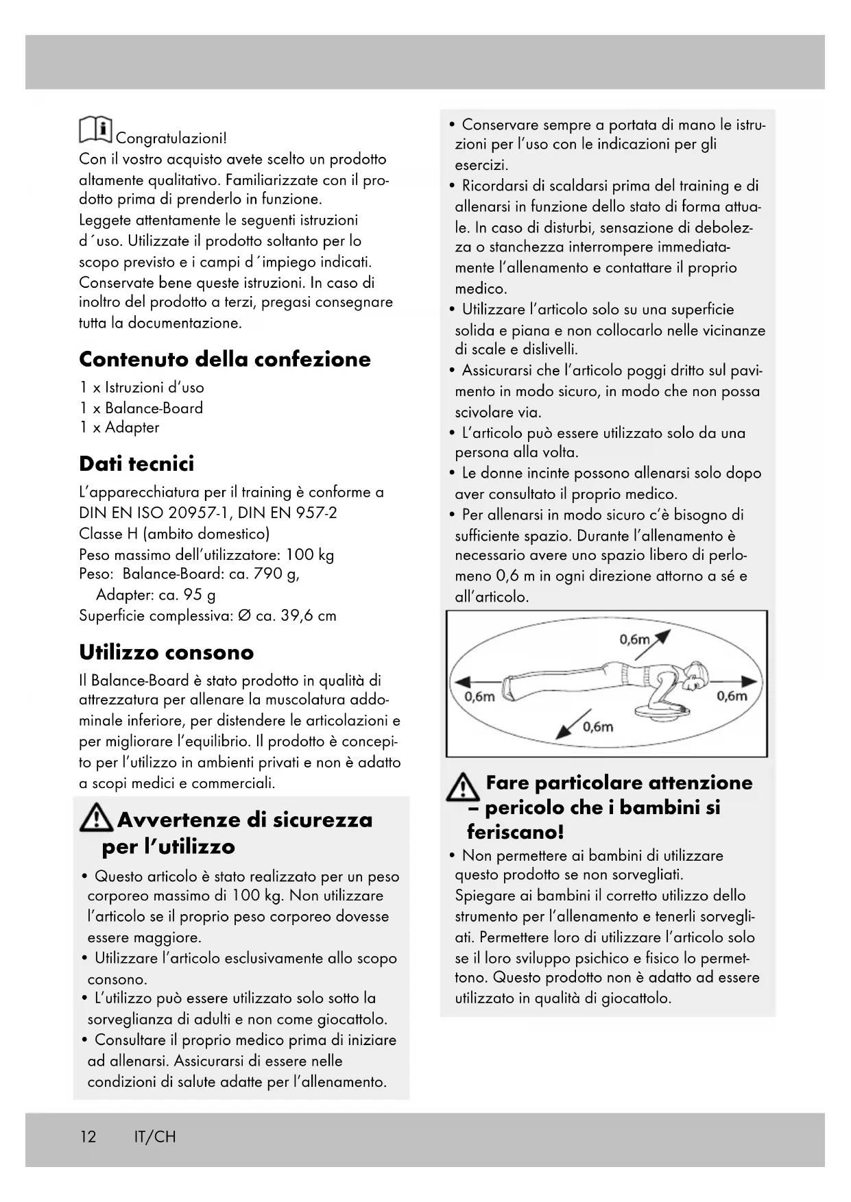 Importante: fare attenzione che le cosce rimangano parallele una accanto all’altra. Il bacino va spinto in avanti, il busto rimane eretto. Cura e conservazione Conservare l’articolo sempre asciutto e pulito in un ambiente temperato. IMPORTANTE! Pulire solo con acqua, mai con prodotti detergenti aggressivi. Asciugare quindi con un panno. Avvertenze sullo smaltimento Smaltire il prodotto e tutti i relativi componenti affidandosi ad un’azienda autorizzata per lo smaltimento oppure alla struttura comunale competente. Osservare le normative vigenti. In caso di dubbi richiedere informazioni presso la struttura competente su come smaltire l’articolo in modo ecologico. 3 anni di garanzia Questo prodotto è stato fabbricato con grande attenzione e sottoposto a costanti controlli. La garanzia è di tre anni dalla data d’acquisto. Conservi lo scontrino fiscale. La garanzia vale solo su difetti di materiale o di fabbricazione e decade in caso di uso errato o non conforme. Questa garanzia non costituisce una limitazione ai Suoi diritti legali e in partico- lare al diritto di garanzia. Per eventuali reclami vi preghiamo di contattare il seguente servizio hotline o mettervi in comunicazione con noi via e-mail. I nostri addetti all‘assistenza concorde- ranno con voi come procedere nel modo più rapido possibile. In qualsiasi caso vi consigliere- mo per le vostre esigenze specifiche. Il periodo di garanzia non viene prolungato a seguito di riparazioni effettuate in garanzia, secondo il diritto di garanzia o per correntezza commerciale. Lo stesso vale anche per le parti sostituite o riparate. Le riparazioni dopo la scadenza della garanzia verranno effettuate a pagamento. IAN: 271472 Assistenza Svizzera Tel.: 0842 665566 (0,08 CHF/Min., telefonia mobile max. 0,40 CHF/Min.) E-Mail: deltasport@lidl.ch Potete ordinare gli articoli anche direttamente sul nostro online shop: www.delta-sport.info IT/CH16 Congratulations! With your purchase you have decided on a high-quality product. Get to know the product before you start to use it. Carefully read the following instructions for use. Use the product only as described and only for the given areas of application. Keep these instructions safe. When passing the product on to a third party, always make sure that the documentation is included. Scope of delivery 1 x Instructions for use 1 x Balance board 1 x Adapter Technical data This training device complies with DIN EN ISO