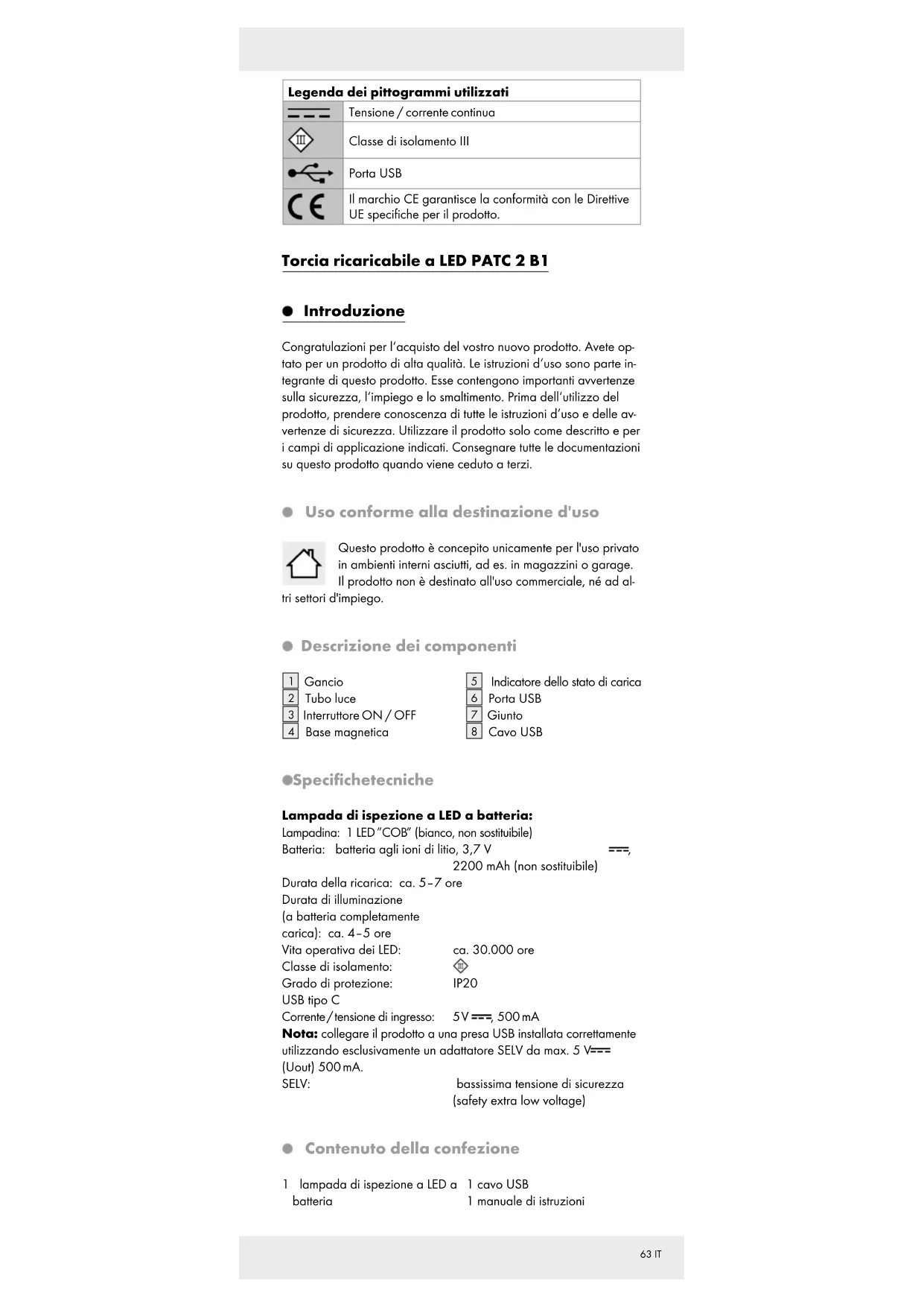 2200 mAh (non sostituibile) Durata della ricarica: ca. 5–7 ore Durata di illuminazione (a batteria completamente carica): ca. 4–5 ore Vita operativa dei LED: ca. 30.000 ore Classe di isolamento: Grado di protezione: IP20 USB tipo C Corrente / tensione di ingresso: 5 V , 500 mA Nota: collegare il prodotto a una presa USB installata correttamente utilizzando esclusivamente un adattatore SELV da max. 5 V (Uout) 500 mA. SELV: bassissima tensione di sicurezza (safety extra low voltage) Contenuto della confezione 1 lampada di ispezione a LED a batteria 1 cavo USB 1 manuale di istruzioni64 IT Avvertenze di sicurezza Prima di utilizzare per la prima volta il prodotto, leggere attentamente tutte le istruzioni per l'uso e le avvertenze in materia di sicurezza! In caso di cessione del prodotto a terzi, consegnare anche l'intera documentazione del prodotto!