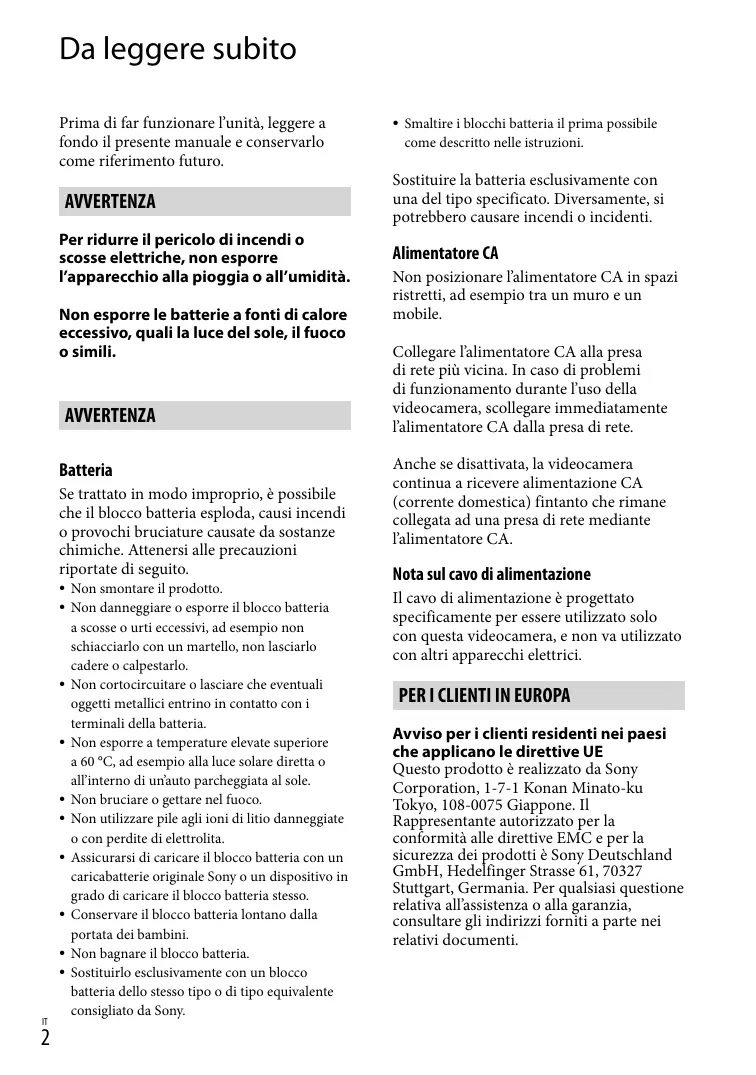 Avviso per i clienti residenti nei paesi che applicano le direttive UE Questo prodotto è realizzato da Sony Corporation, 1-7-1 Konan Minato-ku Tokyo, 108-0075 Giappone. Il Rappresentante autorizzato per la conformità alle direttive EMC e per la sicurezza dei prodotti è Sony Deutschland GmbH, Hedelfinger Strasse 61, 70327 Stuttgart, Germania. Per qualsiasi questione relativa all’assistenza o alla garanzia, consultare gli indirizzi forniti a parte nei relativi documenti. Attenzione Il campo elettromagnetico alle frequenze specifiche può influenzare l’immagine e il suono di questa unità. Il presente prodotto è stato testato ed è risultato conforme ai limiti stabiliti dalla Direttiva EMC relativa all’uso dei cavi di collegamento di lunghezza inferiore a 3 metri. Nota Se l’elettricità statica o interferenze elettromagnetiche causano l’interruzione del trasferimento dei dati, che pertanto non avviene, è necessario riavviare l’applicazione oppure scollegare, quindi ricollegare il cavo di comunicazione (USB e così via). Trattamento del dispositivo elettrico o elettronico a fine vita (applicabile in tutti i paesi dell’Unione Europea e in altri paesi europei con sistema di raccolta differenziata) Questo simbolo sul prodotto o sulla confezione indica che il prodotto non deve essere considerato come un normale rifiuto domestico, ma deve invece essere consegnato ad un punto di raccolta appropriato per il riciclo di apparecchi elettrici ed elettronici. Assicurandovi che questo prodotto sia smaltito correttamente, voi contribuirete a prevenire potenziali conseguenze negative per l’ambiente e per la salute che potrebbero altrimenti essere causate dal suo smaltimento inadeguato. Il riciclaggio dei materiali aiuta a conservare le risorse naturali. Per informazioni più dettagliate circa il riciclaggio di questo prodotto, potete contattare l’ufficio comunale, il servizio locale di smaltimento rifiuti oppure il negozio dove l’avete acquistato. In caso di smaltimento abusivo di apparecchiature elettriche e/o elettroniche potrebbero essere applicate le sanzioni previste dalla normativa applicabile (valido solo per l’Italia). Trattamento delle pile esauste (applicabile in tutti i paesi dell’Unione Europea e in altri paesi Europei con sistema di raccolta differenziata) Questo simbolo sul prodotto o sulla confezione indica che la pila non deve essere considerata un normale rifiuto domestico. Su alcuni tipi di pile questo simbolo potrebbe essere utilizzato in combinazione con un simbolo chimico. I simboli chimici del mercurio (Hg) o del piombo (Pb) sono aggiunti, se la batteria contiene più dello 0,0005% di mercurio o dello 0,004% di piombo. Assicurandovi che le pile siano smaltite correttamente, contribuirete a prevenire potenziali conseguenze negative per l’ambiente e per la salute che potrebbero altrimenti essere causate dal loro inadeguato smaltimento. Il riciclaggio dei materiali aiuta a conservare le risorse naturali. In caso di prodotti che per motivi di sicurezza, prestazione o protezione dei dati richiedano un collegamento fisso ad una pila interna, la stessa dovrà essere sostituita solo da personale di assistenza qualificato. Consegnare il prodotto a fine vita al punto di raccolta idoneo allo smaltimento di apparecchiature elettriche ed elettroniche; questo assicura che anche la pila al suo interno venga trattata correttamente. Per le altre pile consultate la sezione relativa alla rimozione sicura delle pile. Conferire le pile esauste presso i punti di raccolta indicati per il riciclo. Per informazioni più dettagliate circa lo smaltimento della pila esausta o del prodotto, potete contattare il Comune, il servizio locale di smaltimento rifiuti oppure il negozio dove l’avete acquistato.