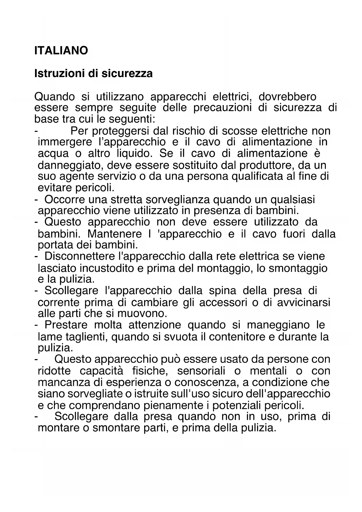 Los dispositivos eléctricos y electrónicos no pueden ser descartado junto con los desechos domésticos. La ley obliga a los consumidores a devolver los dispositivos eléctricos y electrónicos al final de su vida útil a los puntos de recogida públicos establecidos para este propósito o punto de venta. Los detalles de esto están definidos por la ley nacional del país respectivo. Este símbolo en el aparato, el manual de instrucciones o el paquete indica que el aparato está sujeto a estas regulaciones. Al reciclar, reutilizar los materiales u otras formas de usar dispositivos antiguos, está haciendo una contribución importante para proteger nuestro medio ambiente. Adeva SAS / H.Koenig Europe - 8 rue Marc Seguin, 77290 Mitry-Mory, France www.hkoenig.com - https://sac.hkoenig.com - Tél: +33 1 64 67 00 05ITALIANO Istruzioni di sicurezza Quando si utilizzano apparecchi elettrici, dovrebbero essere sempre seguite delle precauzioni di sicurezza di base tra cui le seguenti: - Per proteggersi dal rischio di scosse elettriche non immergere l’apparecchio e il cavo di alimentazione in acqua o altro liquido. Se il cavo di alimentazione è danneggiato, deve essere sostituito dal produttore, da un suo agente servizio o da una persona qualificata al fine di evitare pericoli. - Occorre una stretta sorveglianza quando un qualsiasi apparecchio viene utilizzato in presenza di bambini. - Questo apparecchio non deve essere utilizzato da bambini. Mantenere l 'apparecchio e il cavo fuori dalla portata dei bambini. - Disconnettere l'apparecchio dalla rete elettrica se viene lasciato incustodito e prima del montaggio, lo smontaggio e la pulizia. - Scollegare l'apparecchio dalla spina della presa di corrente prima di cambiare gli accessori o di avvicinarsi alle parti che si muovono. - Prestare molta attenzione quando si maneggiano le lame taglienti, quando si svuota il contenitore e durante la pulizia. - Questo apparecchio può essere usato da persone con ridotte capacità fisiche, sensoriali o mentali o con mancanza di esperienza o conoscenza, a condizione che siano sorvegliate o istruite sull'uso sicuro dell'apparecchio e che comprendano pienamente i potenziali pericoli. - Scollegare dalla presa quando non in uso, prima di montare o smontare parti, e prima della pulizia.- Evitare contatto con le parti in movimento. Tenere mani, capelli, indumenti, così come spatole e altri utensili lontani durante il funzionamento per ridurre il rischio di lesioni a persone e/o danni al mixer. - Non utilizzare la macchina con un cavo o spina danneggiati, dopo cattivo funzionamento o se l’apparecchio è caduto o si è danneggiato in un qualsiasi modo. Consegnare al più vicino centro di assistenza autorizzato per la verifica, riparazione o regolazione elettrica o meccanica. - L'uso di accessori non raccomandati o venduti dal produttore può provocare incendi, scosse elettriche o lesioni. - Non utilizzare all'aperto. Questo prodotto è solo per uso domestico. - Evitare che il cavo penda dal tavolo o dal banco da lavoro. - Rimuovere le fruste dal mixer prima del lavaggio. - Questo apparecchio può essere utilizzato da bambini di almeno 8 anni di età, purché siano controllati e gli siano state date istruzioni su come usare l’apparecchio in modo sicuro e sono pienamente consapevoli dei pericoli. - La pulizia e manutenzione non devono essere eseguite da bambini a meno che non abbiano almeno 8 anni di età e sono sorvegliati da un adulto. - Mantenere l 'apparecchio e il cavo di alimentazione fuori dalla portata dei bambini sotto gli 8 anni di età. - Quando si utilizzano apparecchiature elettriche, devono sempre essere prese delle misure di sicurezza per prevenire il rischio di incendi, scosse elettriche e/o lesioni in caso di uso improprio. - Assicurarsi che la tensione sulla targhetta corrisponda al voltaggio del vostro impianto. Se così non fosse, contattare il rivenditore e non collegare l'unità.- Conservare il manuale CE per eventuali riferimenti futuri e consegnarlo insieme all’apparecchio ad eventuali futuri utenti. - L’apparecchio è da utilizzaresolo per uso domestico ed interno. - Il vostro apparecchio è stato progettato esclusivamente per un uso domestico. Non è destinato all'uso nelle seguenti situazioni che non sono coperte dalla garanzia: - in cucine per il personale in negozi, uffici e altri ambienti professionali, - in ostelli agricoli, - da ospiti in hotel, motel e altri ambienti residenziali, - in ambienti tipo bed and breakfast.