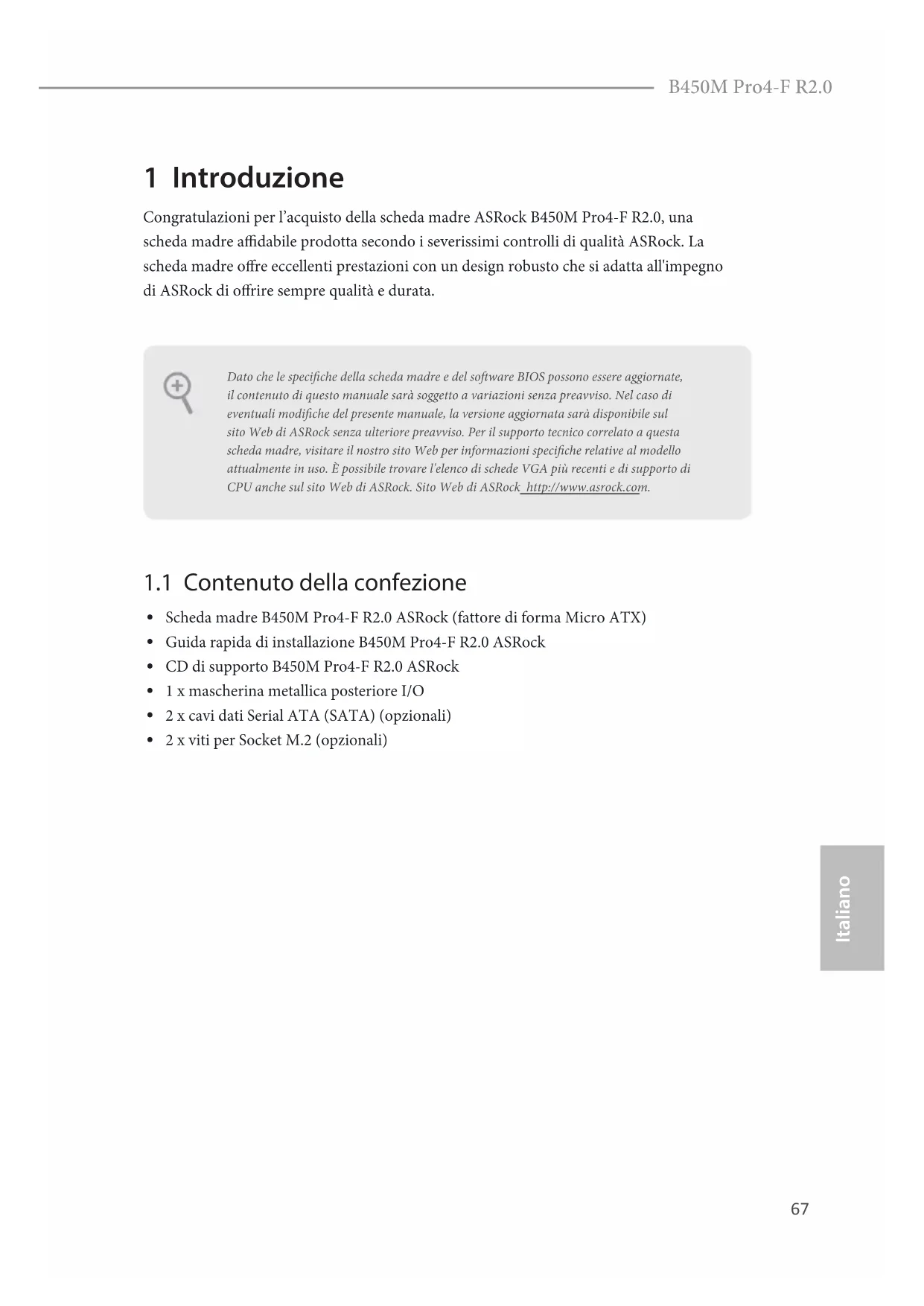 Italiano B450M Pro4-F R2.0 1 Introduzione Congratulazioni per l’acquisto della scheda madre ASRock B450M Pro4-F R2.0, una scheda madre adabile prodotta secondo i severissimi controlli di qualità ASRock. La scheda madre ore eccellenti prestazioni con un design robusto che si adatta all'impegno di ASRock di orire sempre qualità e durata.