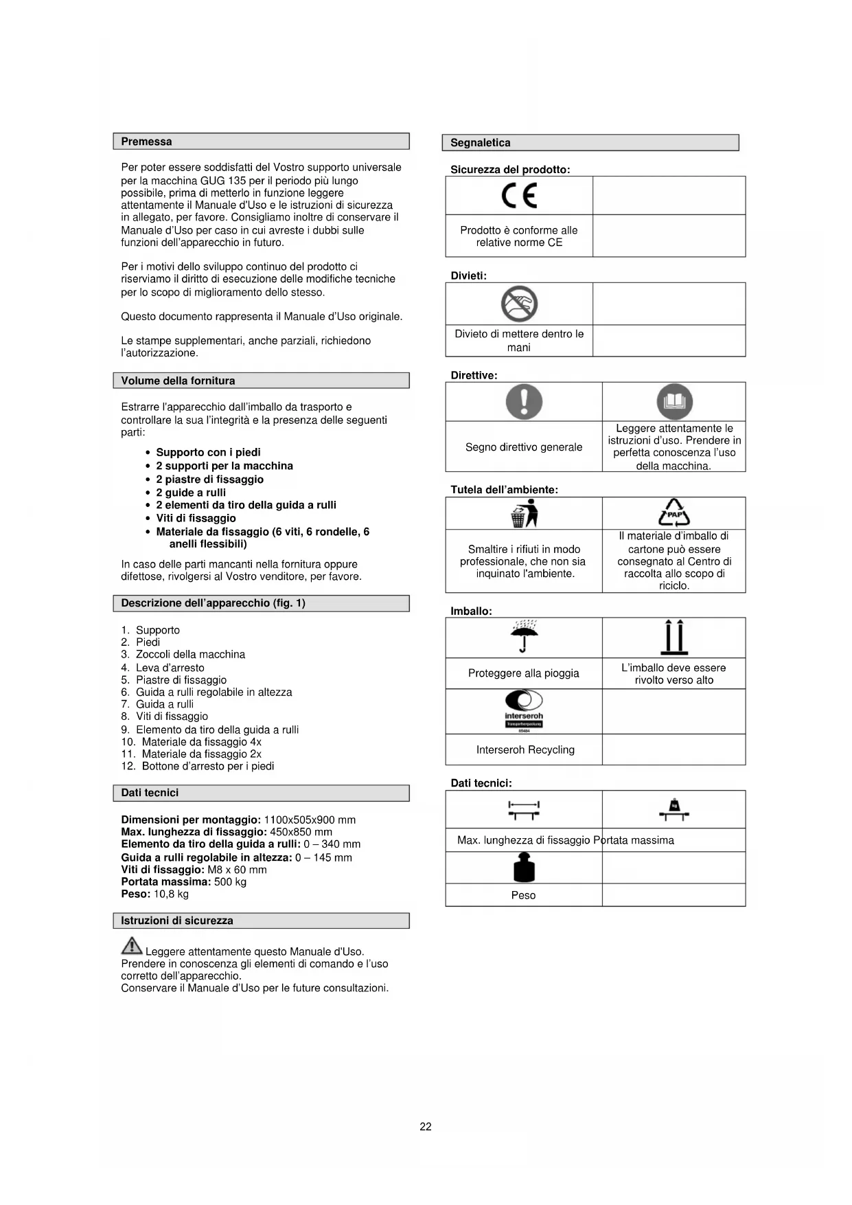 Dati tecnici Dimensioni per montaggio: 1100x505x900 mm Max. lunghezza di fissaggio: 450x850 mm Elemento da tiro della guida a rulli: 0 – 340 mm Guida a rulli regolabile in altezza: 0 – 145 mm Viti di fissaggio: M8 x 60 mm Portata massima: 500 kg Peso: 10,8 kg Istruzioni di sicurezza Leggere attentamente questo Manuale d'Uso. Prendere in conoscenza gli elementi di comando e l’uso corretto dell’apparecchio. Conservare il Manuale d’Uso per le future consultazioni. Segnaletica Sicurezza del prodotto: Prodotto è conforme alle relative norme CE Divieti: Divieto di mettere dentro le mani Direttive: Segno direttivo generale Leggere attentamente le istruzioni d’uso. Prendere in perfetta conoscenza l’uso della macchina. Tutela dell’ambiente: Smaltire i rifiuti in modo professionale, che non sia inquinato l'ambiente. Il materiale d’imballo di cartone può essere consegnato al Centro di raccolta allo scopo di riciclo. Imballo: Proteggere alla pioggia L’imballo deve essere rivolto verso alto Interseroh Recycling Dati tecnici: Max. lunghezza di fissaggio Portata massima Peso 22Addestramento Leggere attentamente il Manuale d’Uso e Manutenzione. Prendere in perfetta conoscenza gli elementi di comando e l’uso corretto dell’apparecchio. Dovete sapere come funziona l‘apparecchio e come si può disattivare rapidamente il dispositivo di comando. Mai consentire ai bambini la manovra dell’apparecchio. Mai permettere l'uso dell'apparecchio dalle persone senza le istruzioni adeguate. Non permettere l’accesso nella zona di lavoro alle persone non adatte, soprattutto ai bambini, né animali. Siate attenti per evitare lo scivolo e/o la caduta. Uso in conformità alla destinazione Il supporto universale per la macchina è stato costruito esclusivamente per supportare le macchine / gli apparecchi elettrici i cui è possibile fissare con la sicurezza sui supporti per la macchina. Il fissaggio perfetto è in cura dell’Utente. Non è possibile eseguire con tal apparecchio i lavori diversi da quelli, per i quali è stato costruito e chi sono descritti nel Manuale d’Uso. Ogni alto uso non è conforme alla destinazione. Il costruttore non assume la responsabilità dei successivi danni e delle ferite. Tenere presente che i nostri apparecchi non sono costruiti per l’uso industriale. Montaggio Montaggio sul supporto (fig. 2-4)